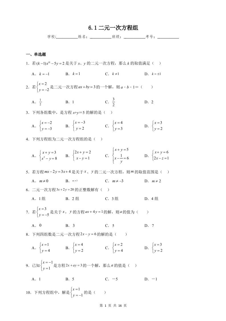 6.1二元一次方程组同步练习(含解析)