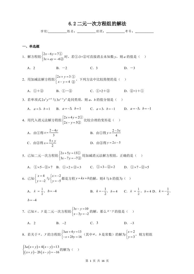 6.2二元一次方程组的解法同步练习(含解析)