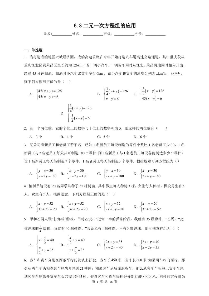 6.3二元一次方程组的应用同步练习(含解析)