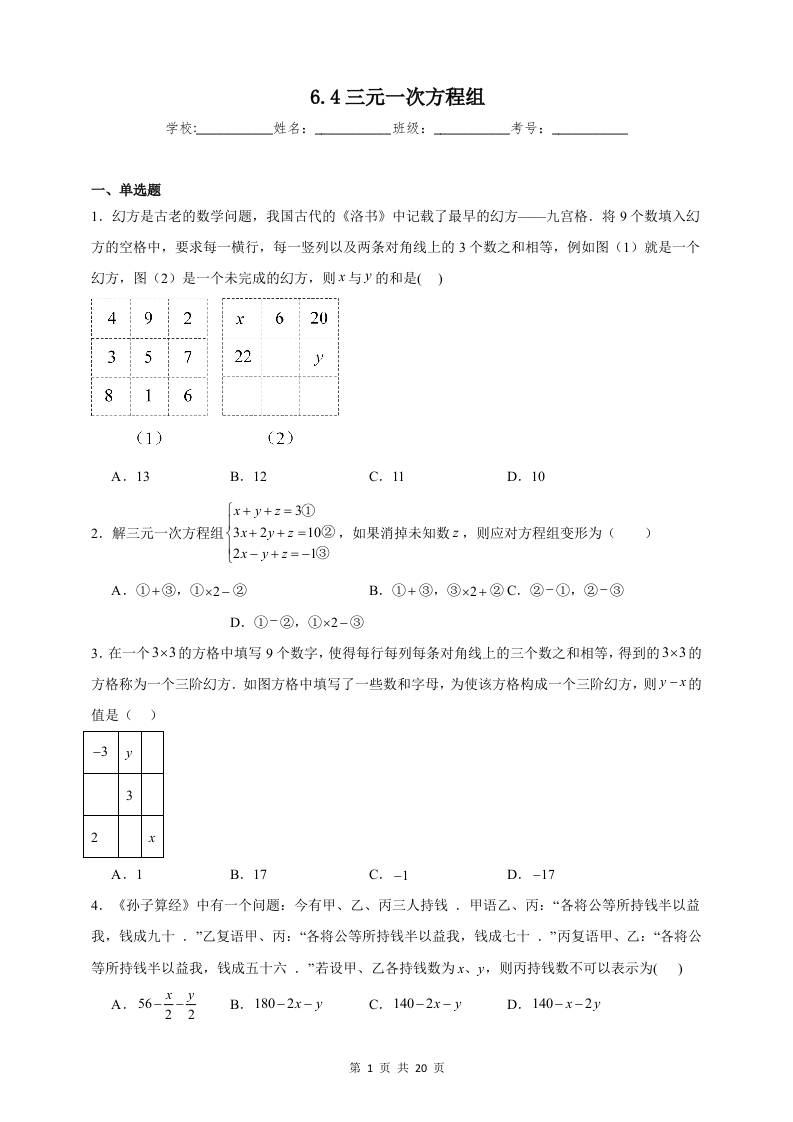 6.4三元一次方程组同步练习(含解析)