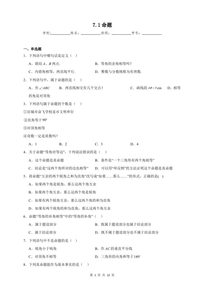7.1 命题 同步练习(含解析)