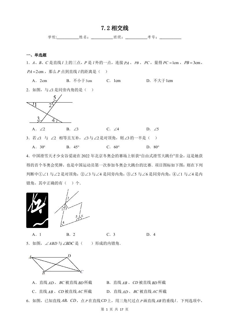 7.2 相交线 同步练习(含解析)