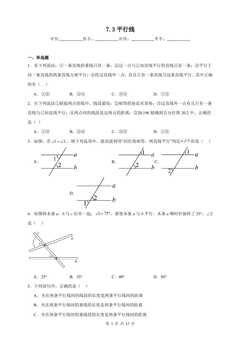 7.3 平行线 同步练习(含解析)