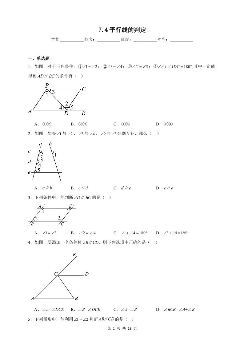 7.4平行线的判定同步练习(含解析)