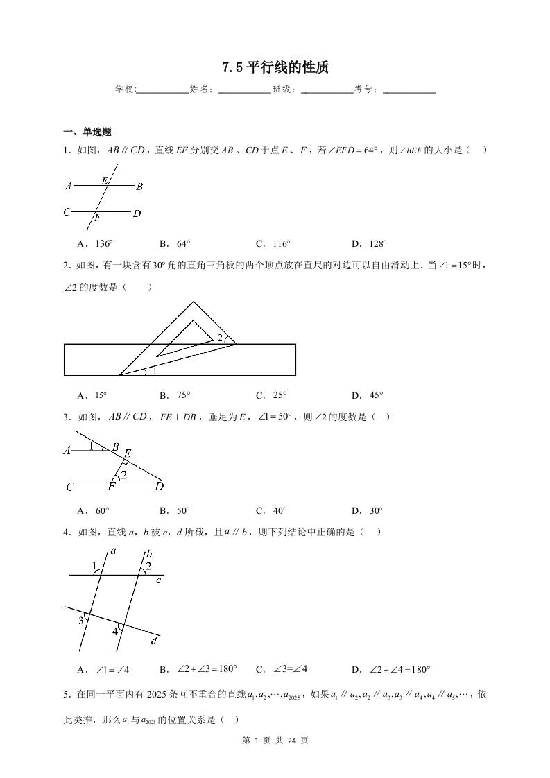 7.5平行线的性质同步练习(含解析)