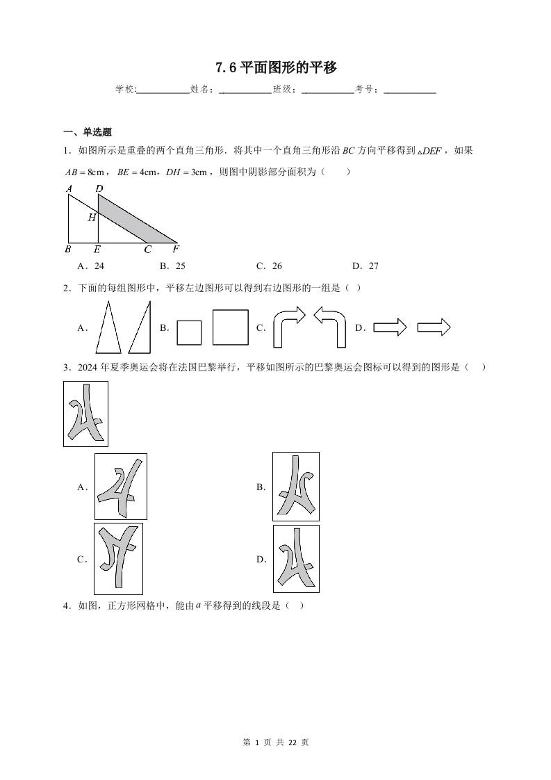 7.6 平面图形的平移 同步练习(含解析)