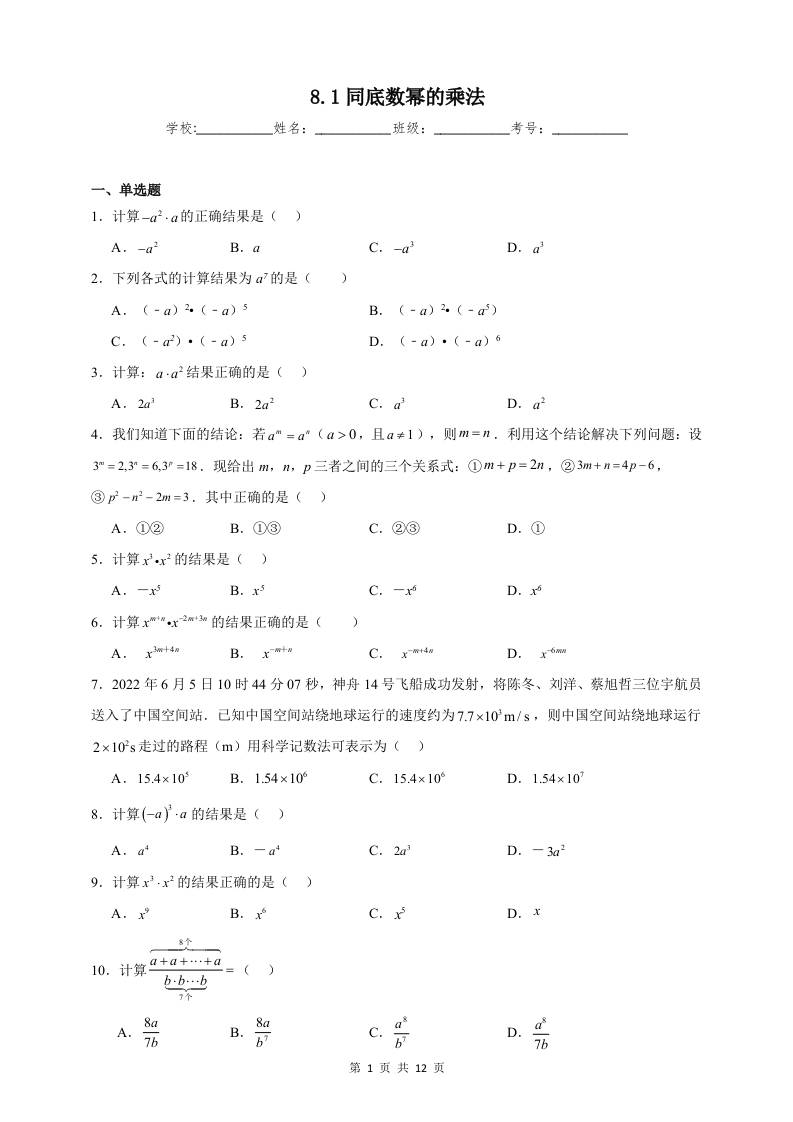 8.1同底数幂的乘法同步练习(含解析)