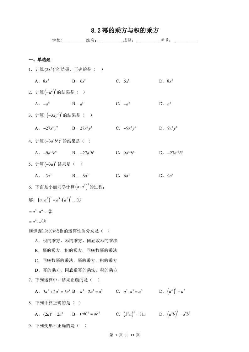 8.2幂的乘方与积的乘方同步练习(含解析)
