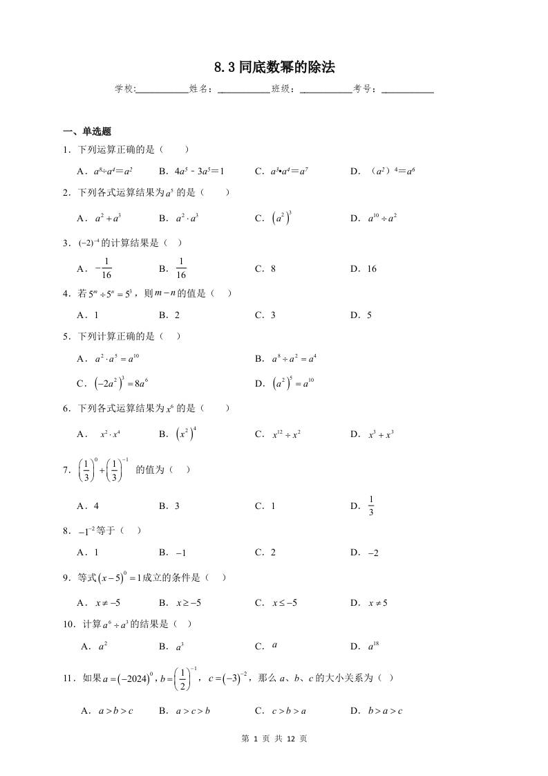 8.3同底数幂的除法同步练习(含解析)