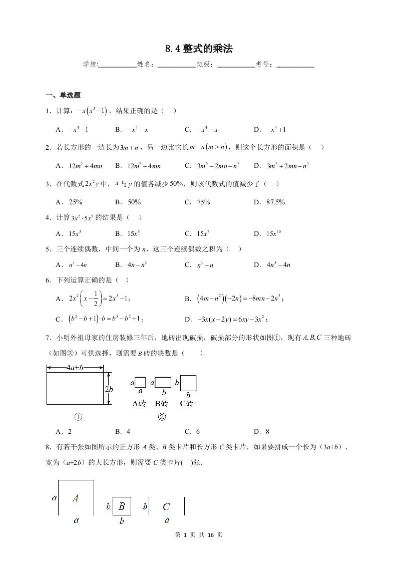 8.4 整式的乘法 同步练习(含解析)