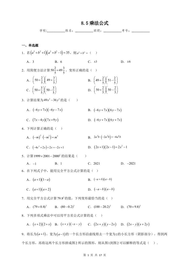 8.5 乘法公式 同步练习(含解析)