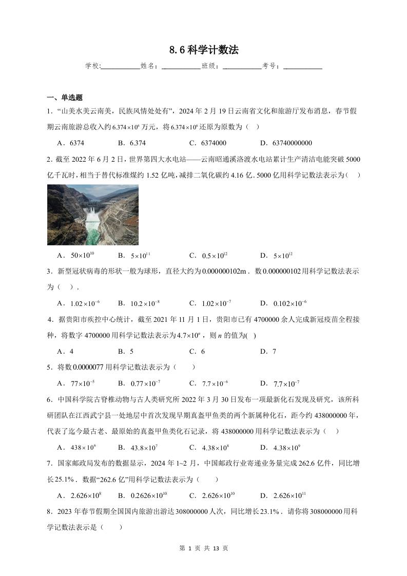 8.6科学计数法同步练习(含解析)