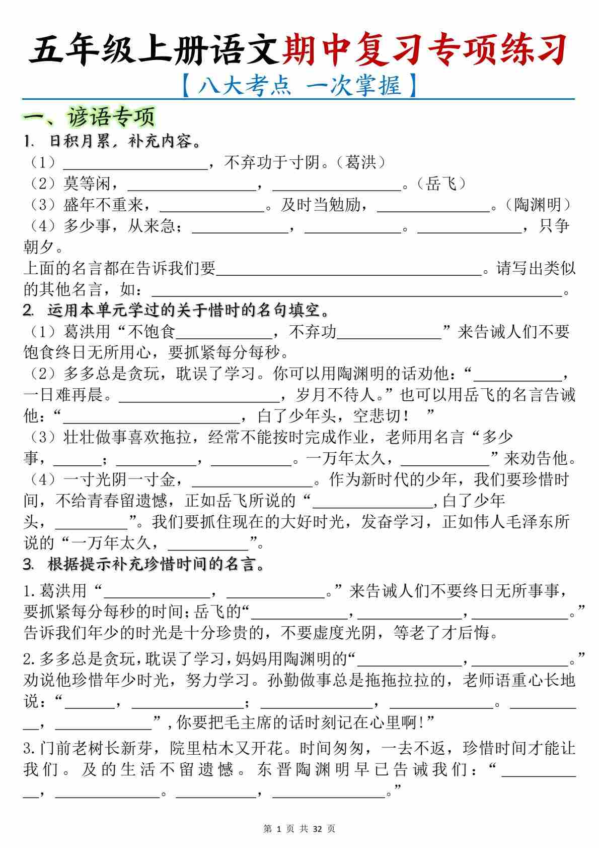 五(上)语文期中古诗名言与课文积累提分卷(含答案15页)