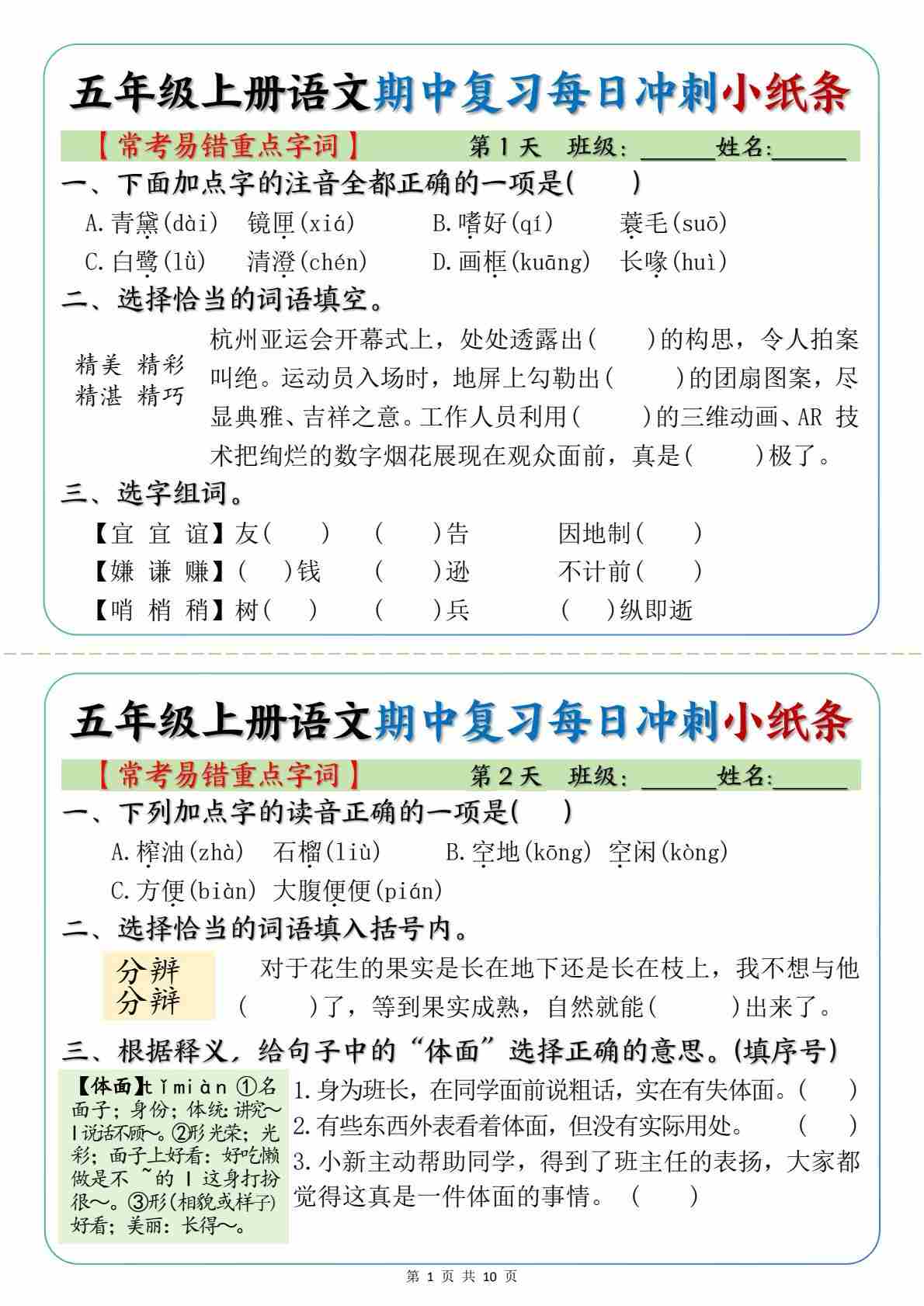 五(上)语文【期中复习冲刺小纸条(常考易错重点字词)】