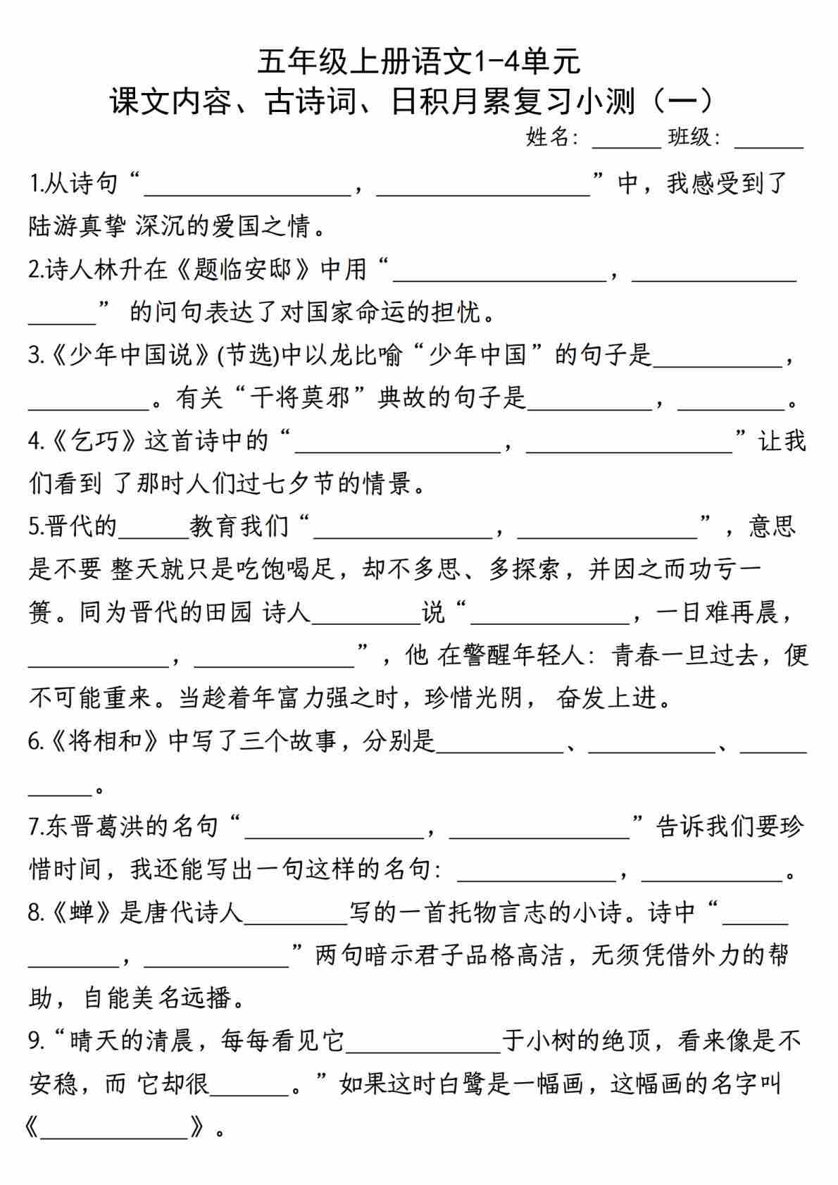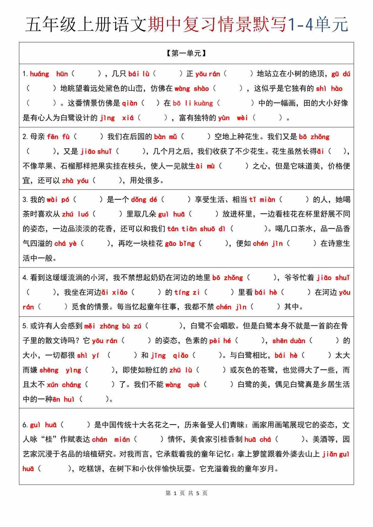 五年级(上)语文 期中复习情景默写1-4单元