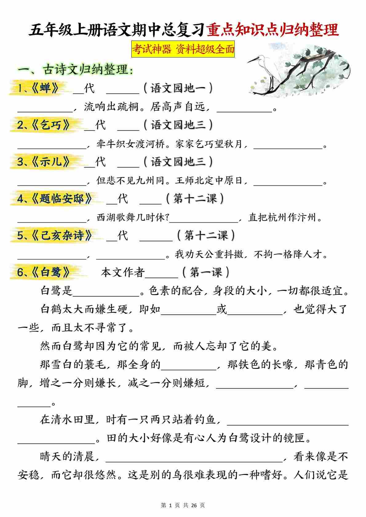 五(上)语文【期中总复习重点知识点归纳整理(空白)】