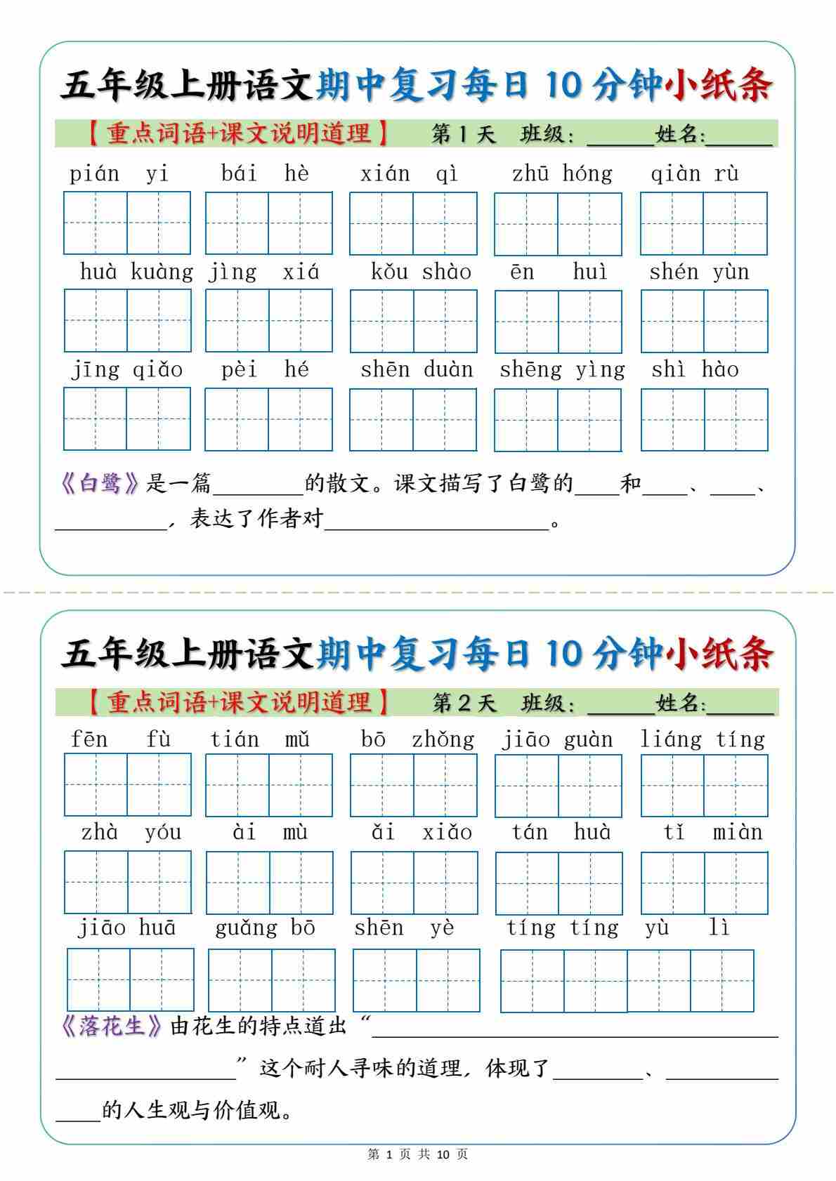 五年级(上)语文 期中复习小纸条