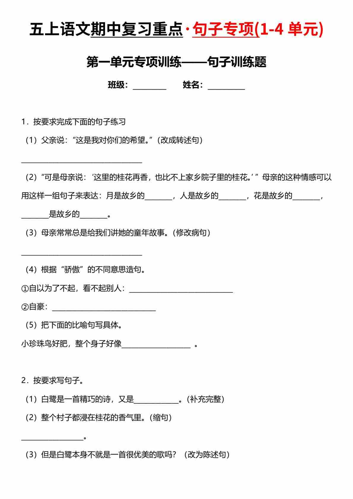 五(上)语文期中满分专训——句式转换》