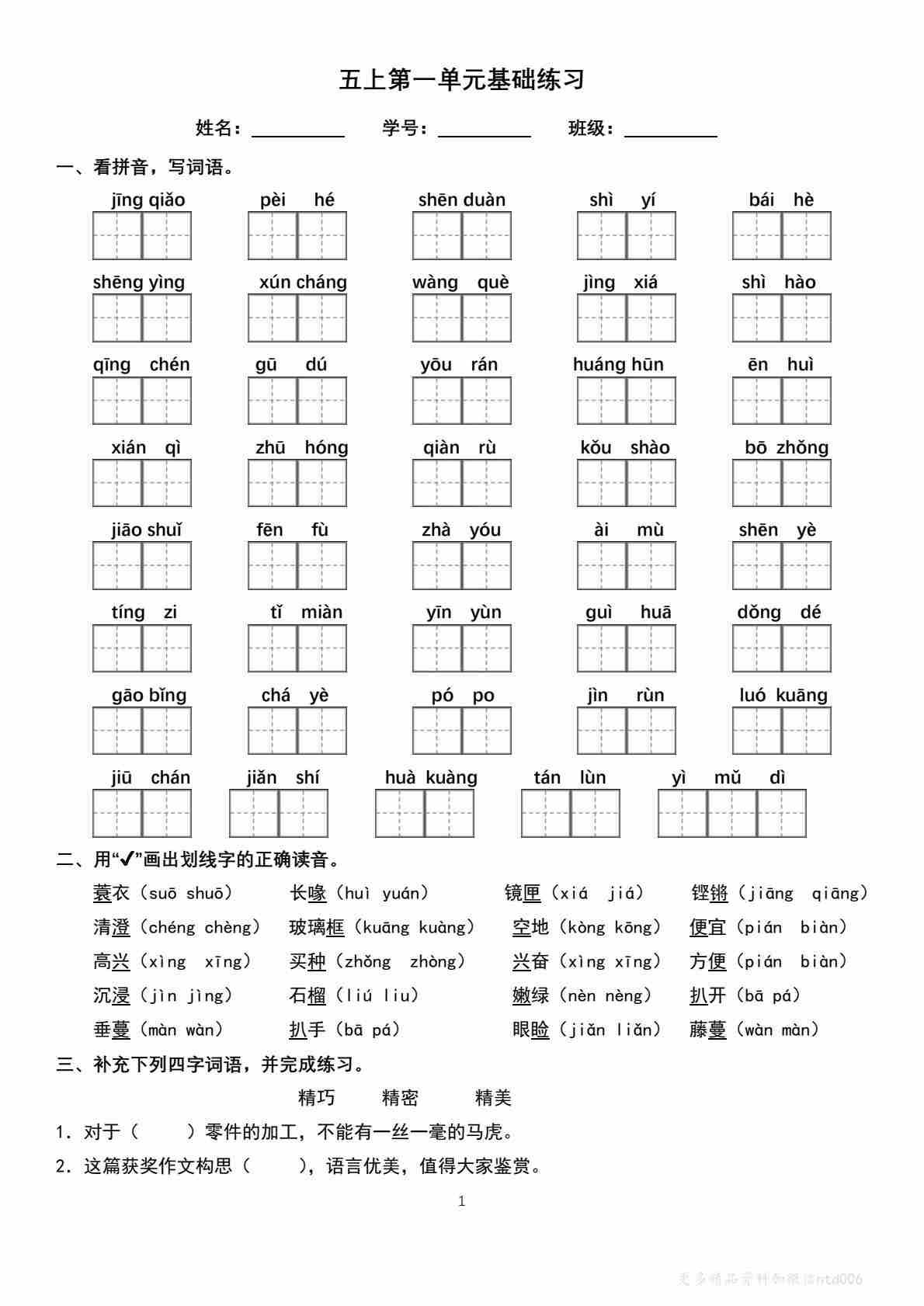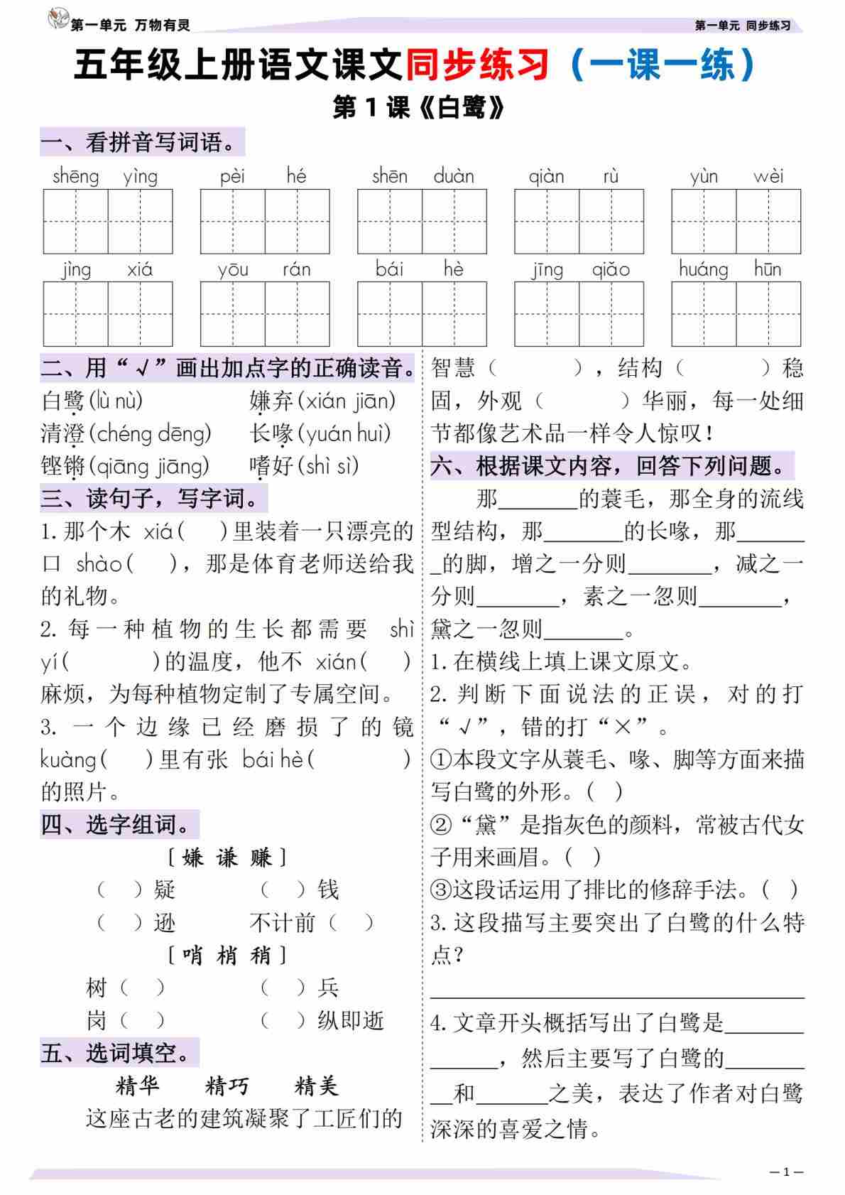 五(上)语文:课文同步练习(一课一练)(含答案)
