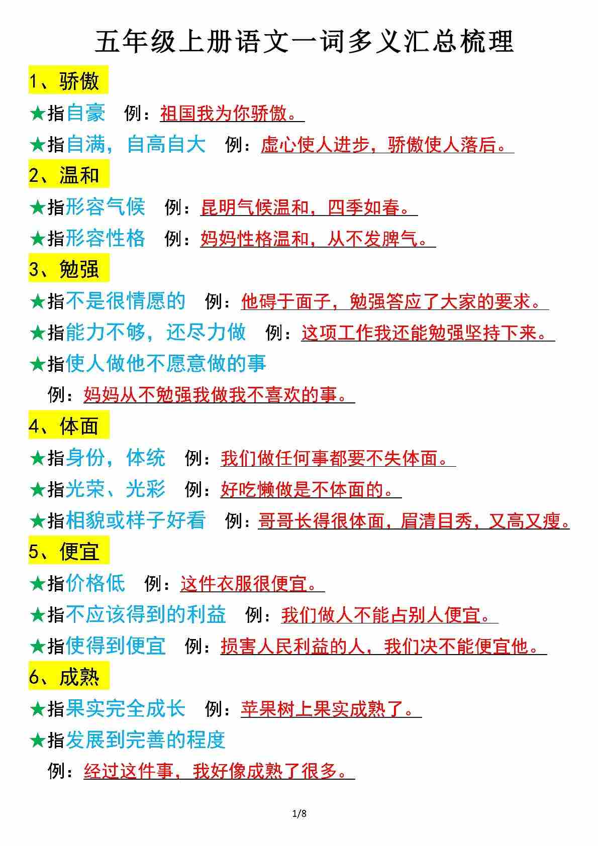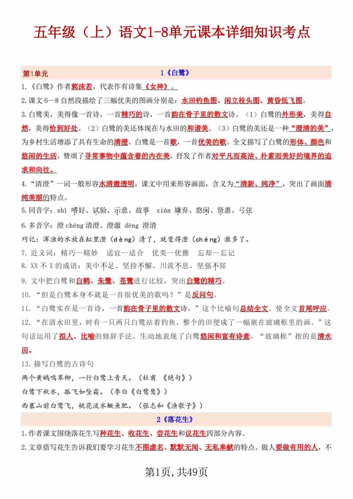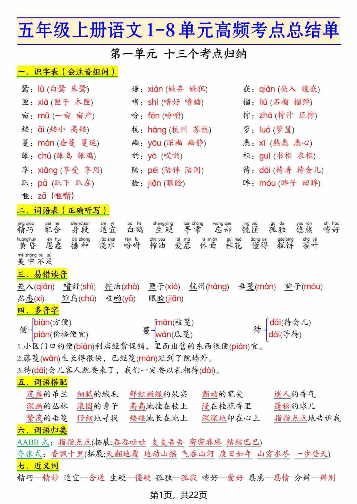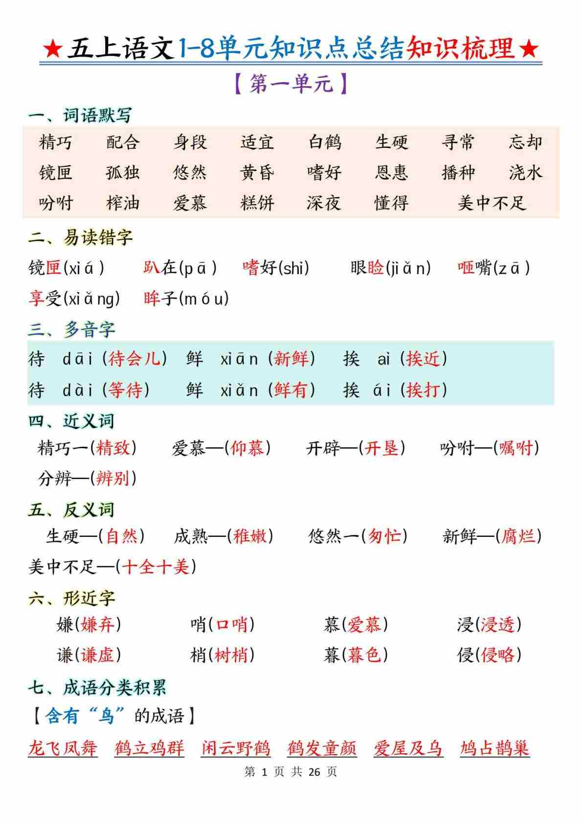 五(上)语文 1-8单元知识点总结知识梳理26页