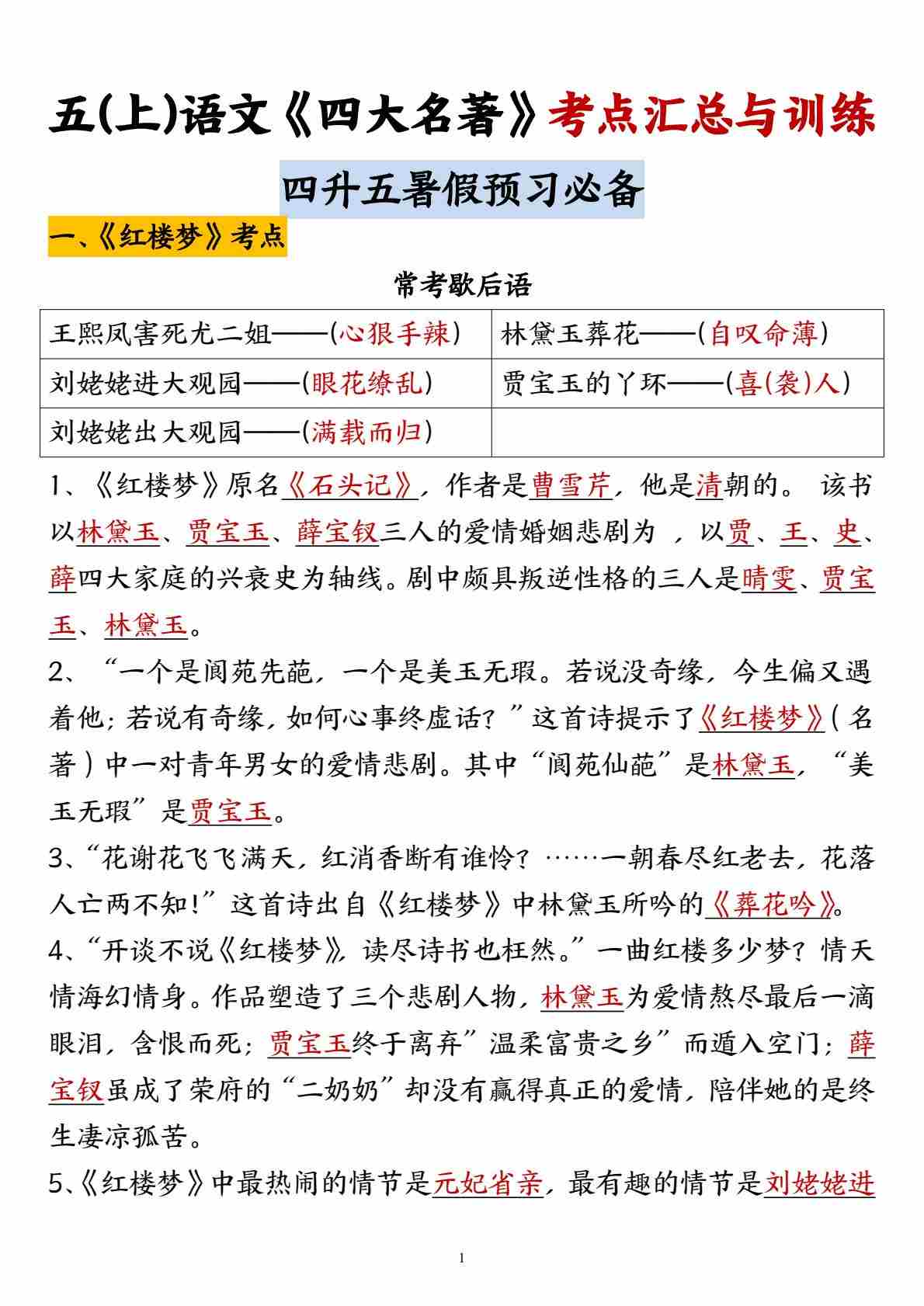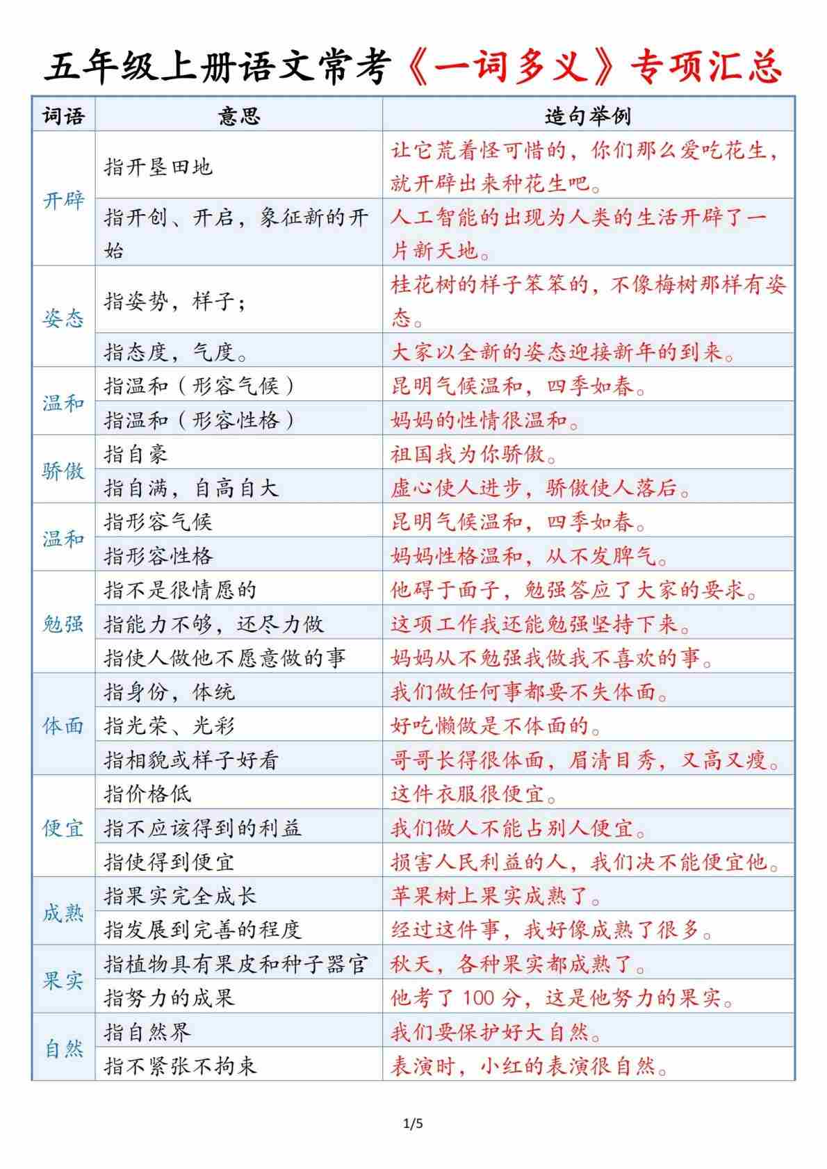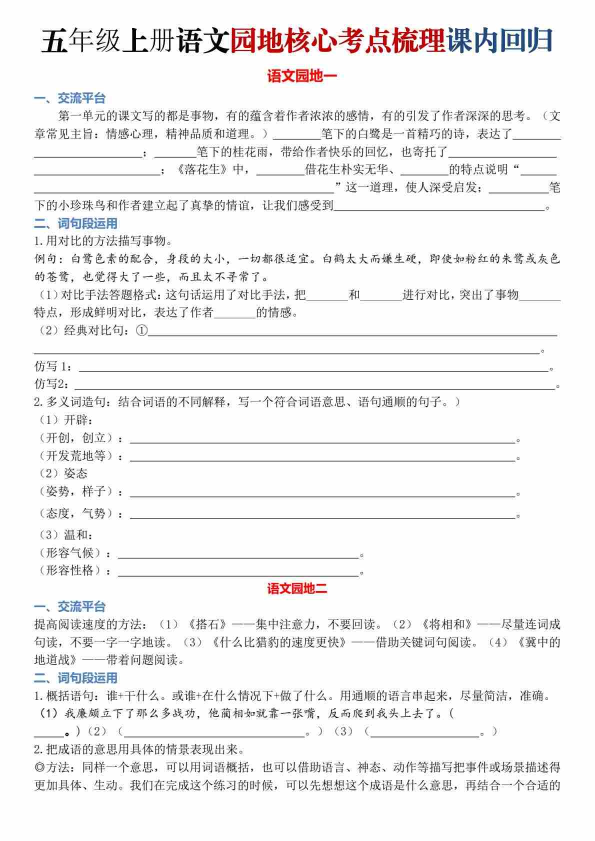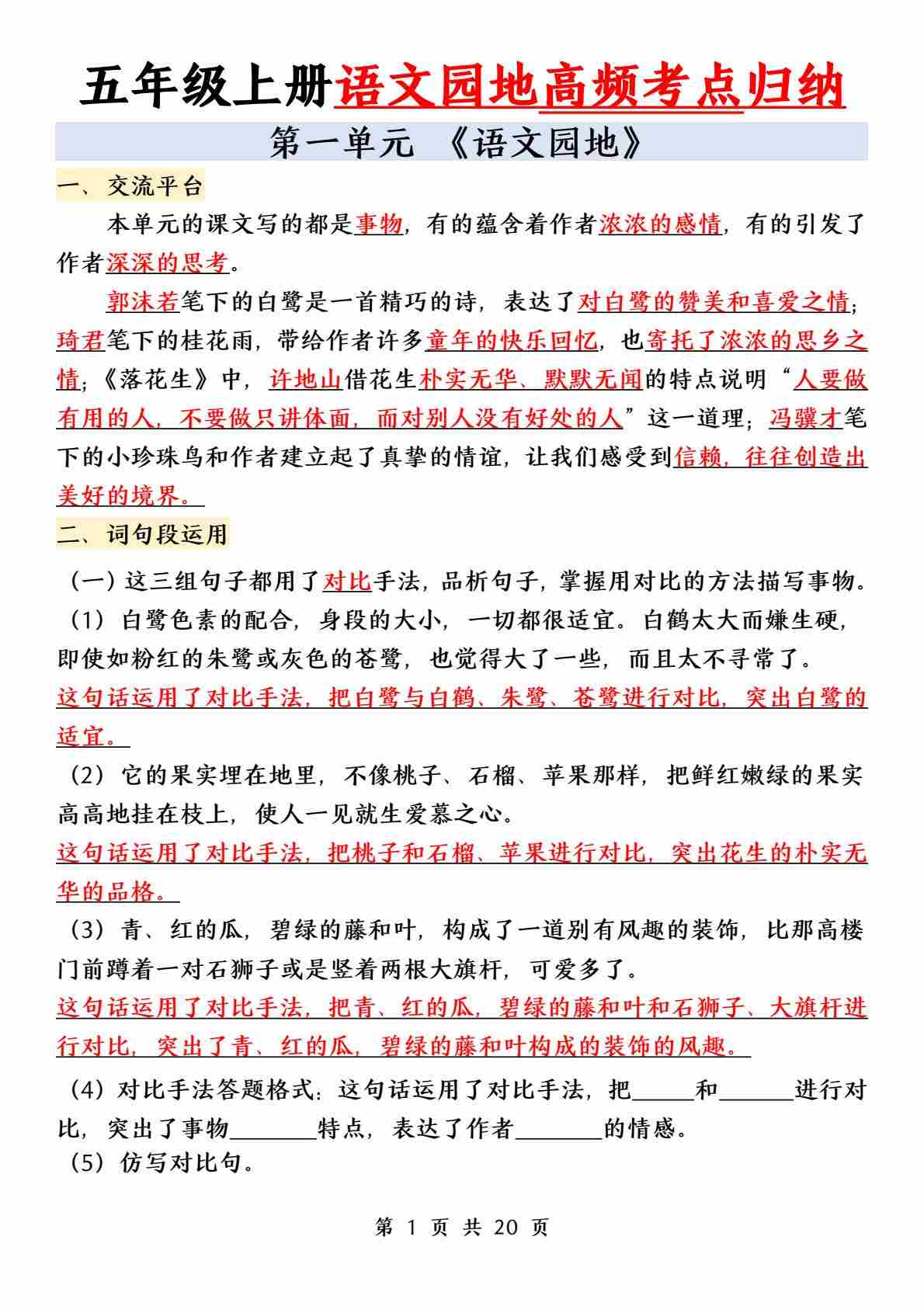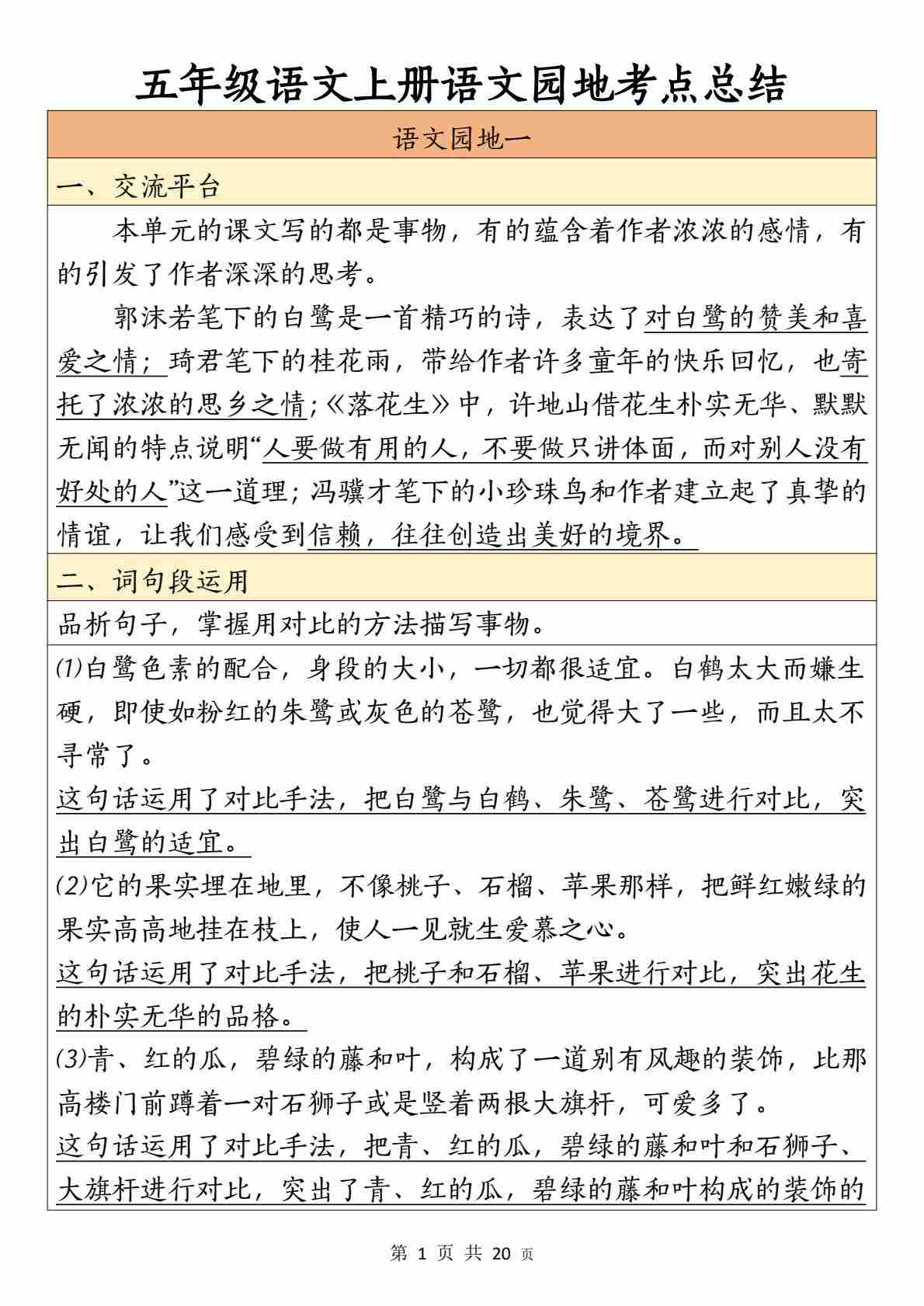 五(上)语文【暑假预习全册重点内容归纳总结】