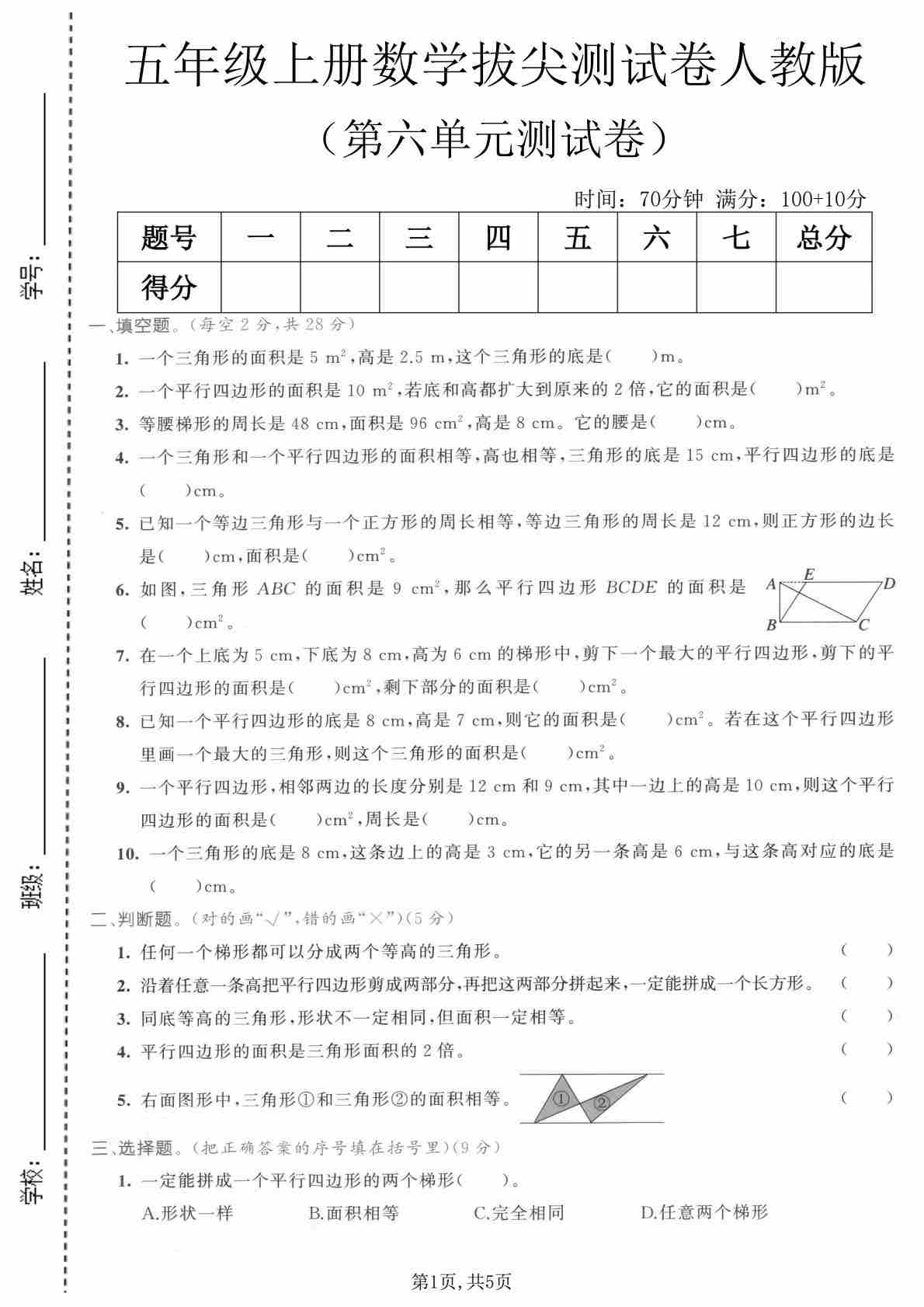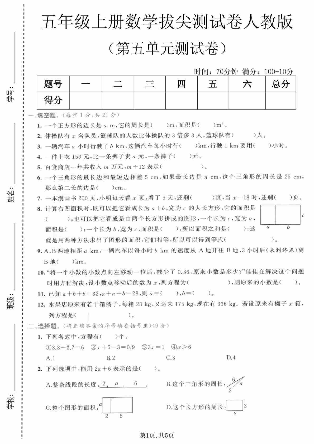 五年级(上)数学第六单元拔尖测试卷1《人教版》