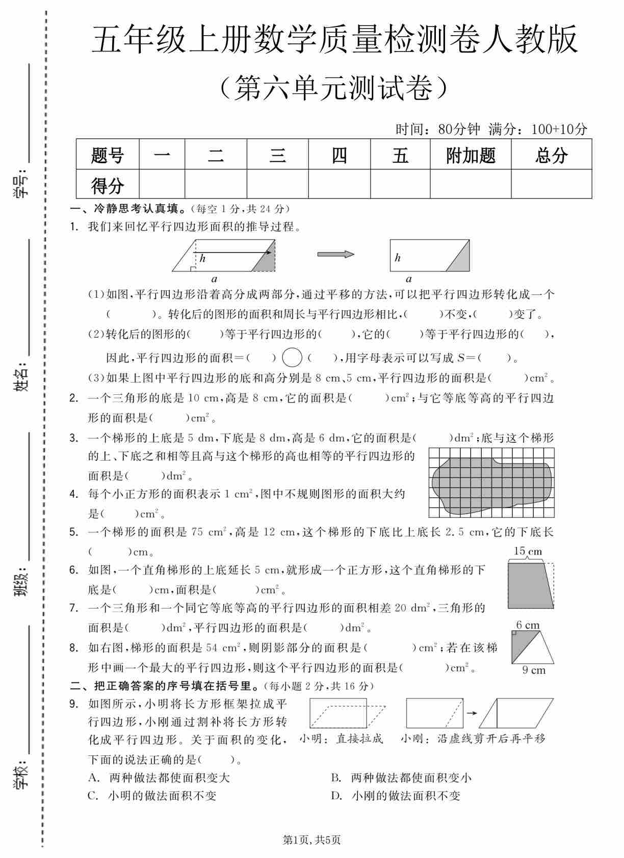 五(上)数学(人教版)2024秋五年级上册数学第五单元综合考查卷