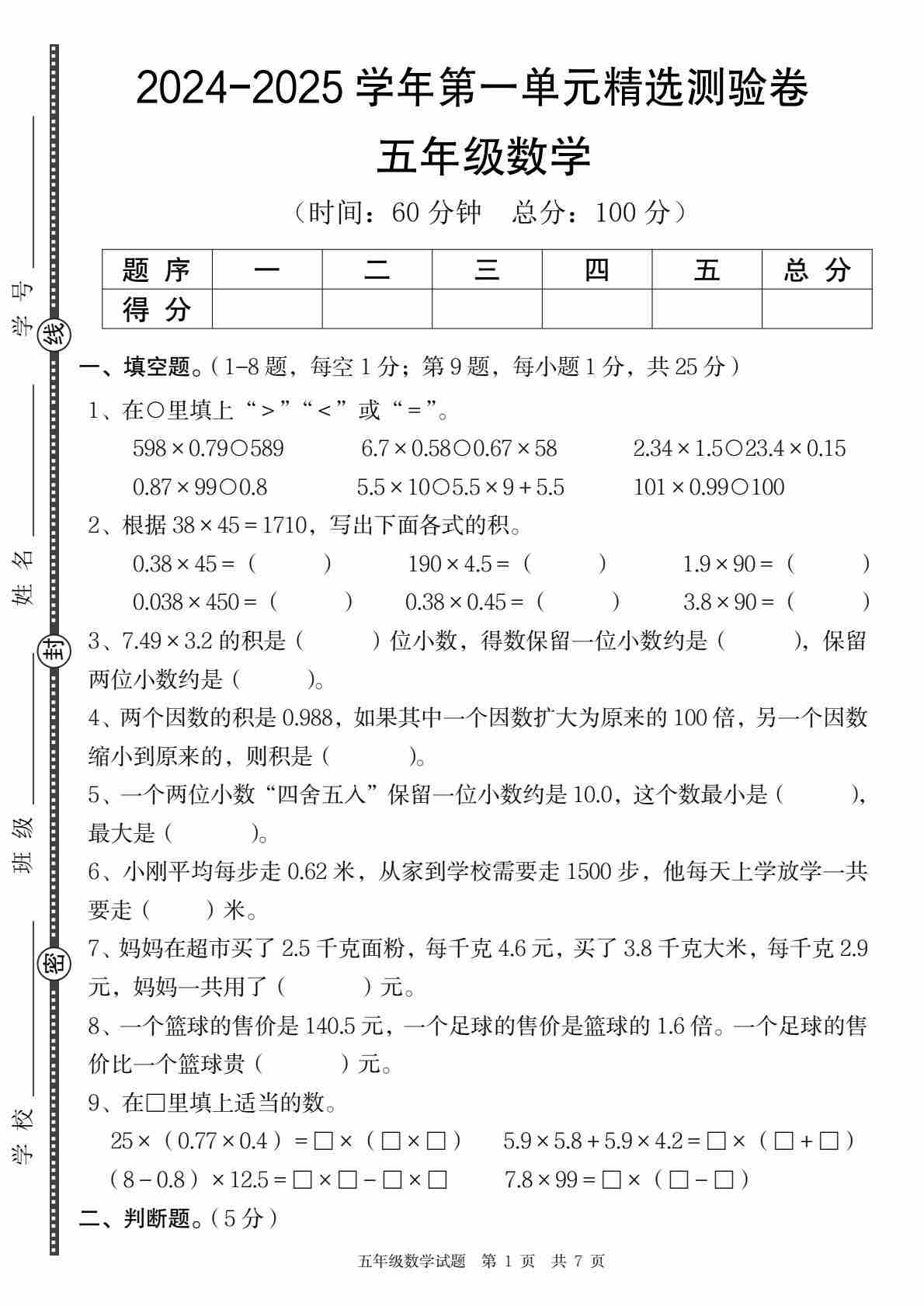 【数学】【人教版】2024-2025学年五年级数学第一单元精选测验卷