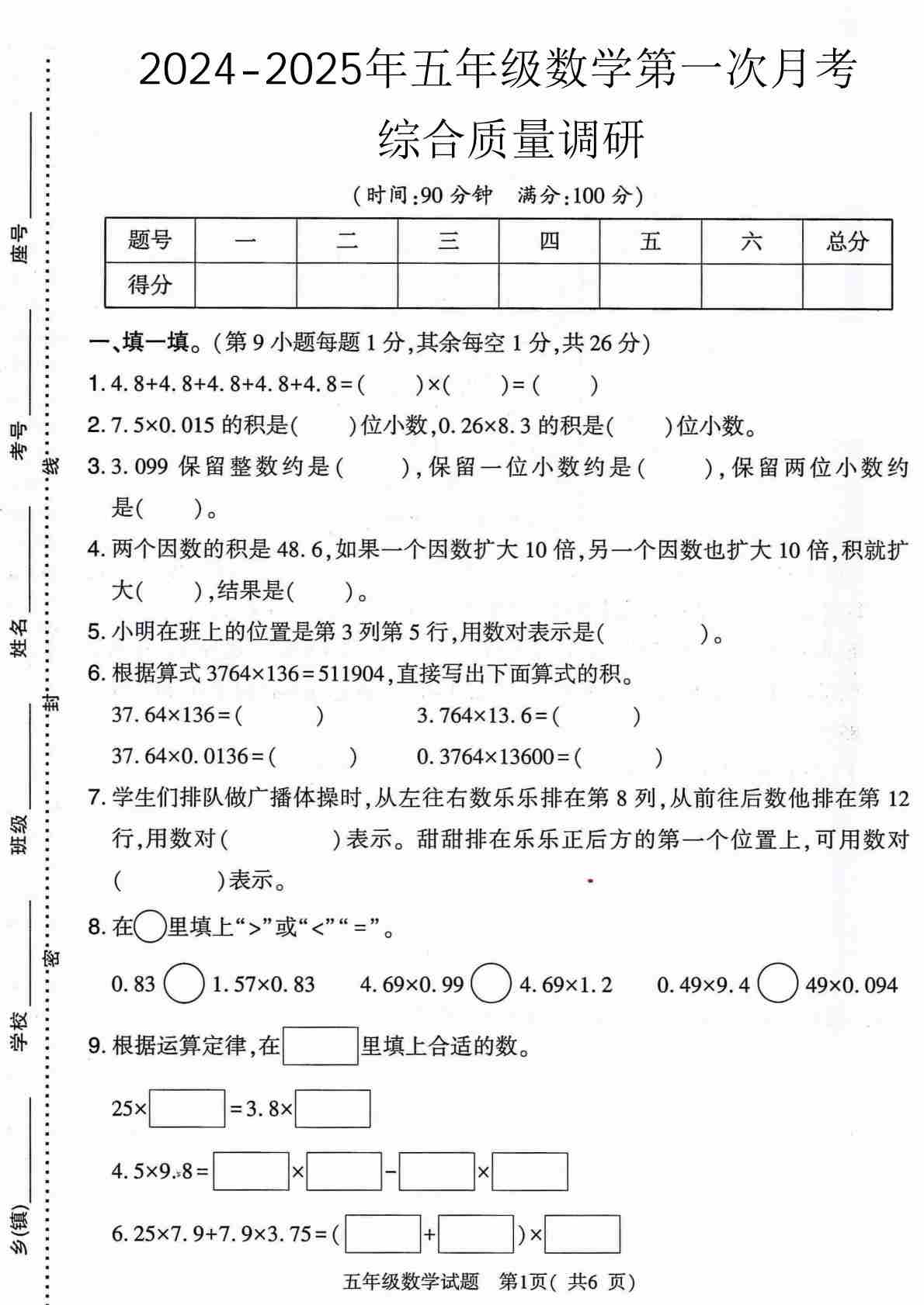 【人教】五上数学第1次月考测评卷 (1)