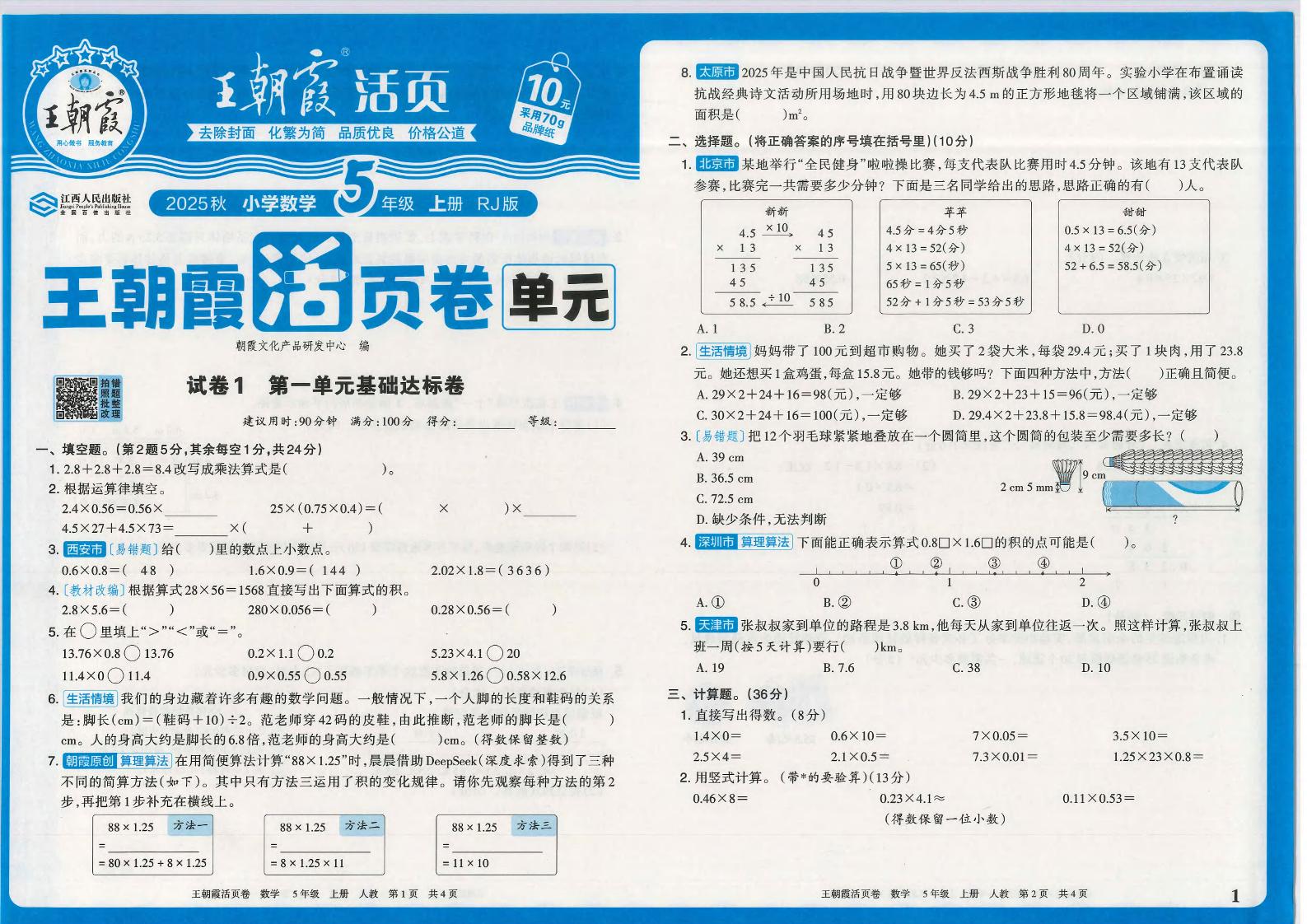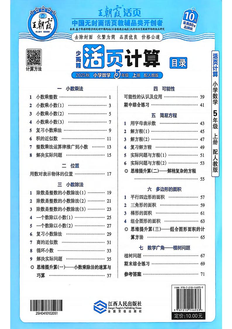 五(上)数学人教版【2025秋-王朝霞活页计算】