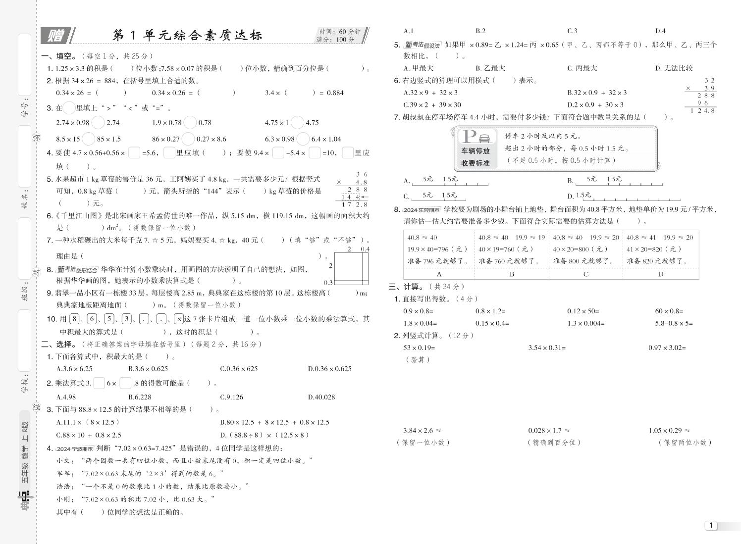 5年级上 数学 阳光同学情景卷