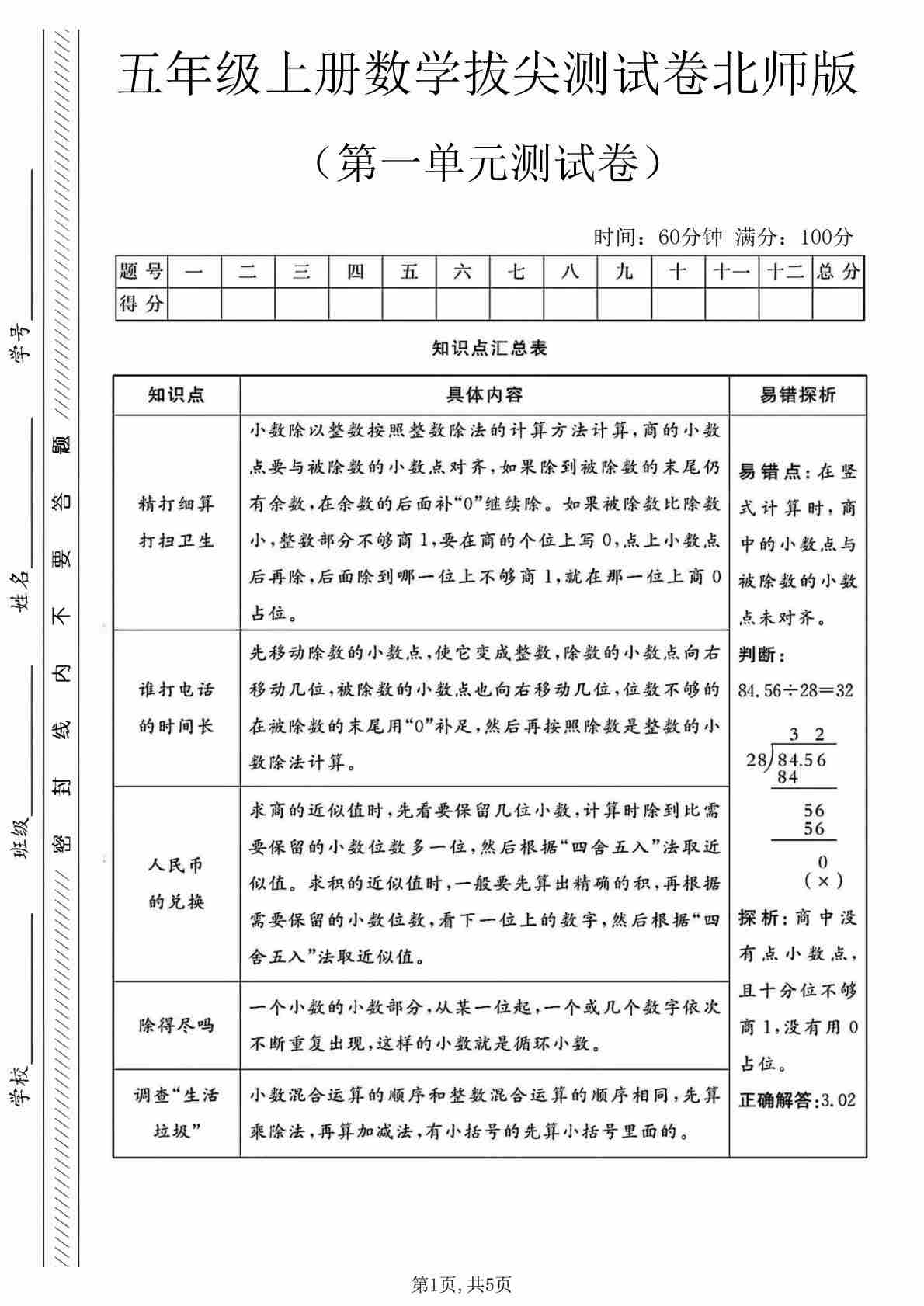 五年级(上)数学 第一单元拔尖测试卷《北师版》