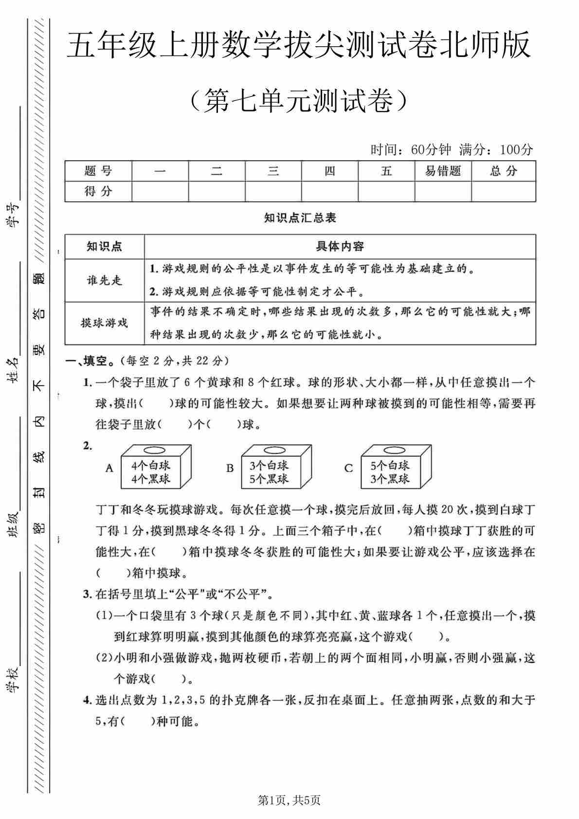 五年级(上)数学第七单元测试卷1《北师版》