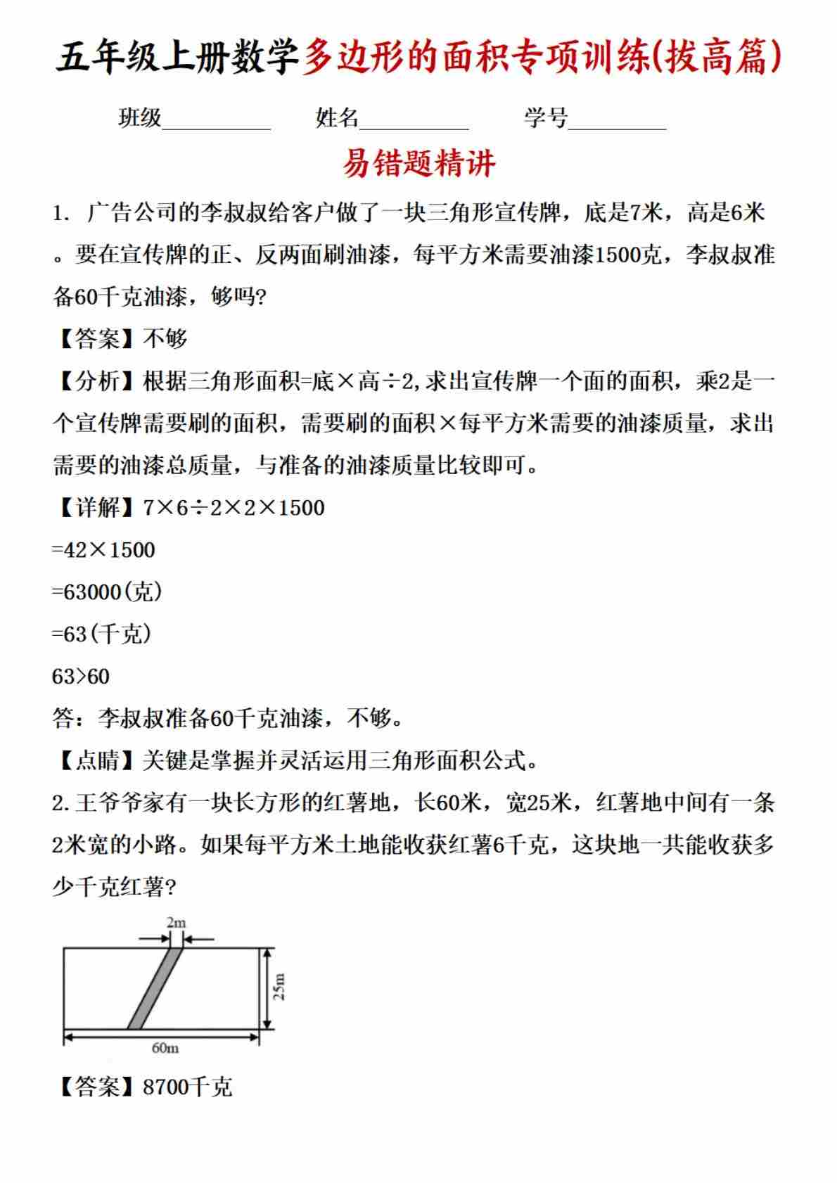 五(上)数学苏教版:(易错专项练)第2练 多边形的面积 解答题常考易错题专项汇编(试题)