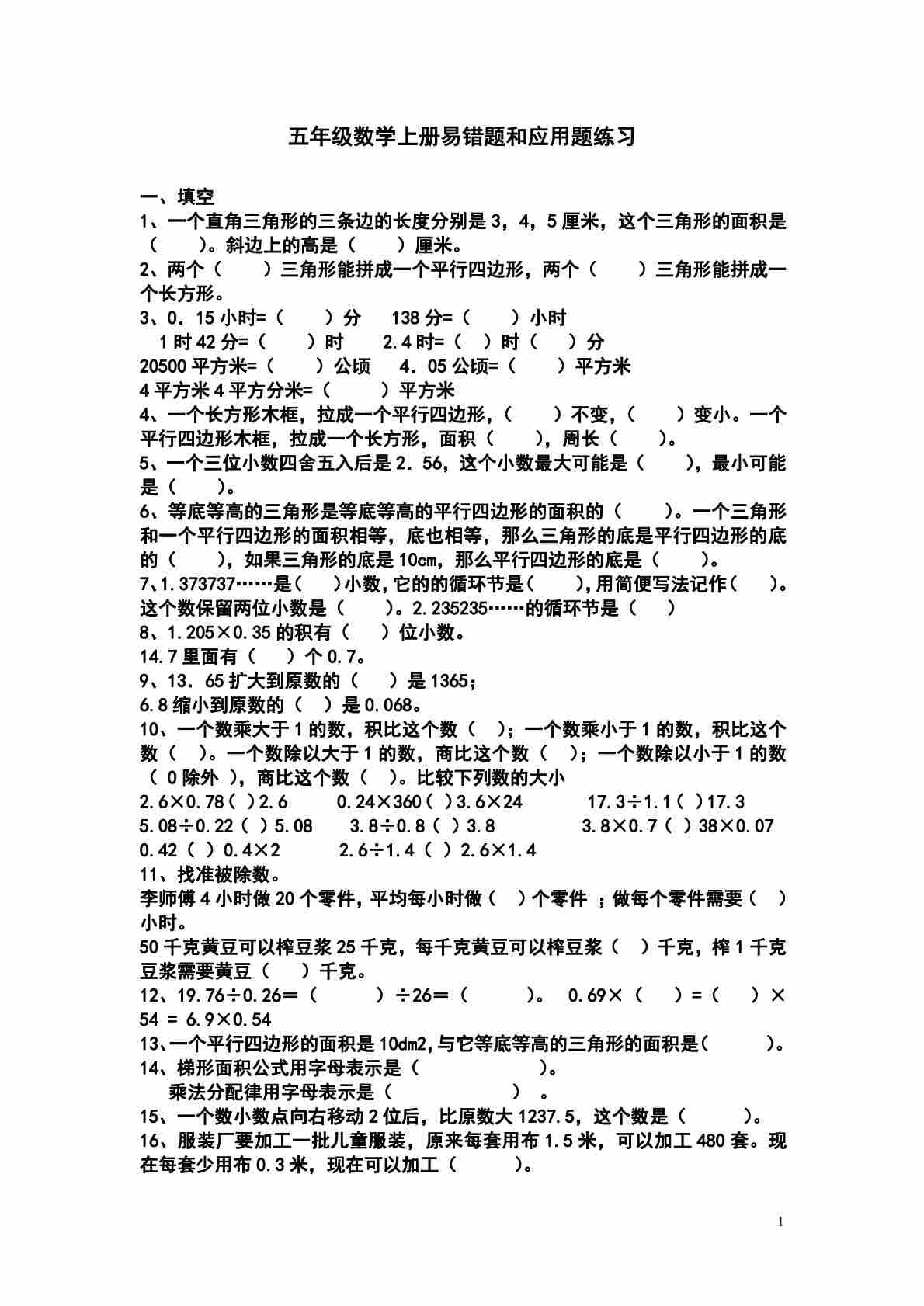 五上苏教版数学易错题和应用题练习