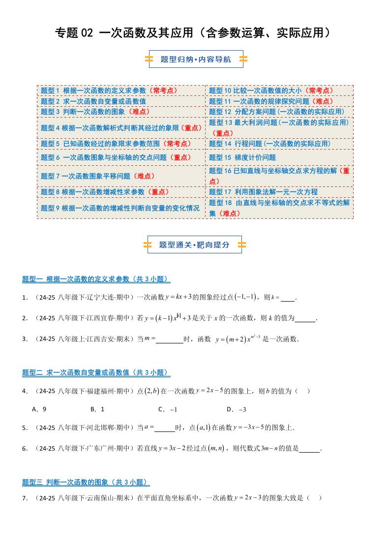 【八上沪科数学】专题02 一次函数及其应用(含参数运算、实际应用)(期中专项训练)(原卷版)八年级数学上学期新教材沪科版