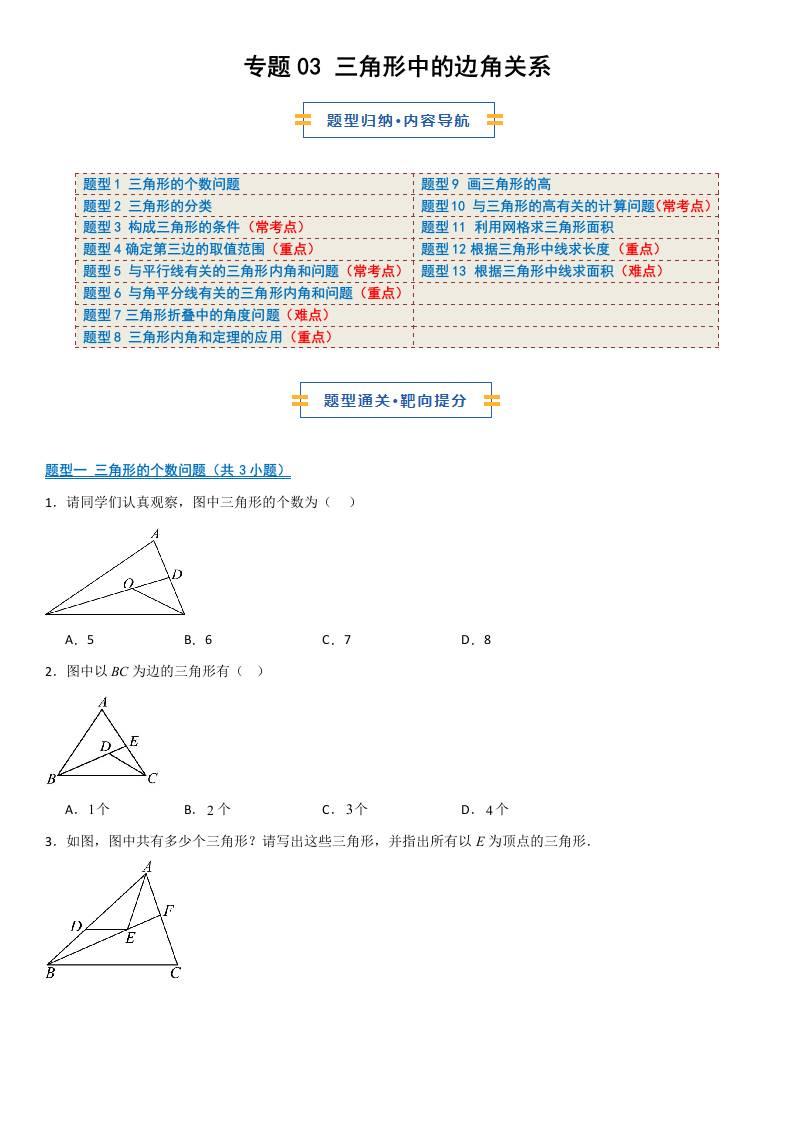 【八上沪科数学】专题03 三角形中的边角关系(期中专项训练)(原卷版)八年级数学上学期新教材沪科版