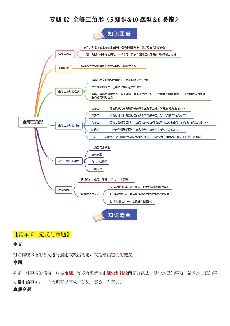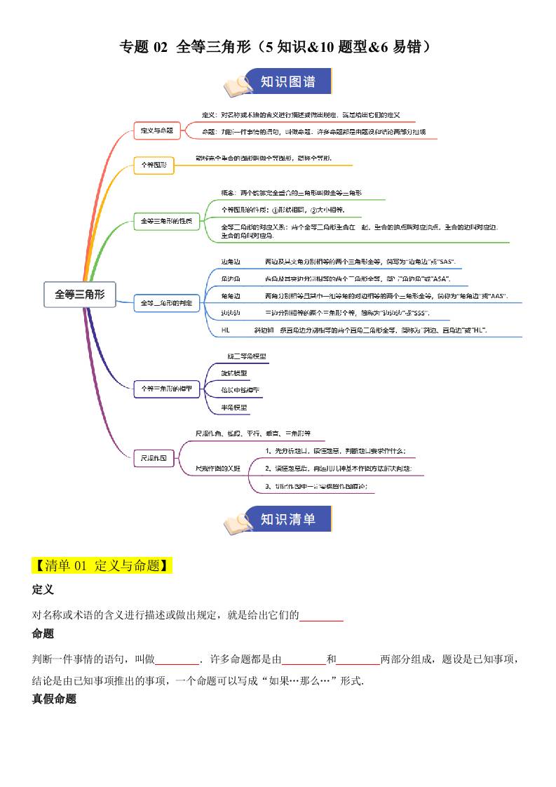 【八上冀教数学】清单02 全等三角形(期中知识清单)(5知识&10题型&6易错)(原卷版)