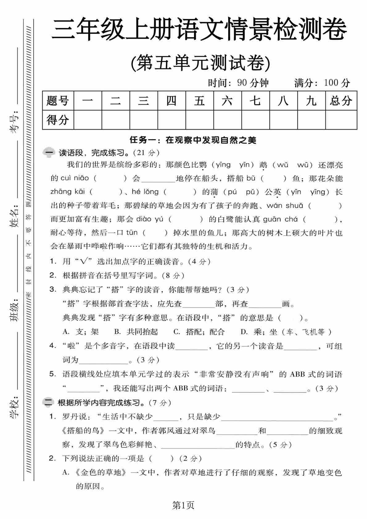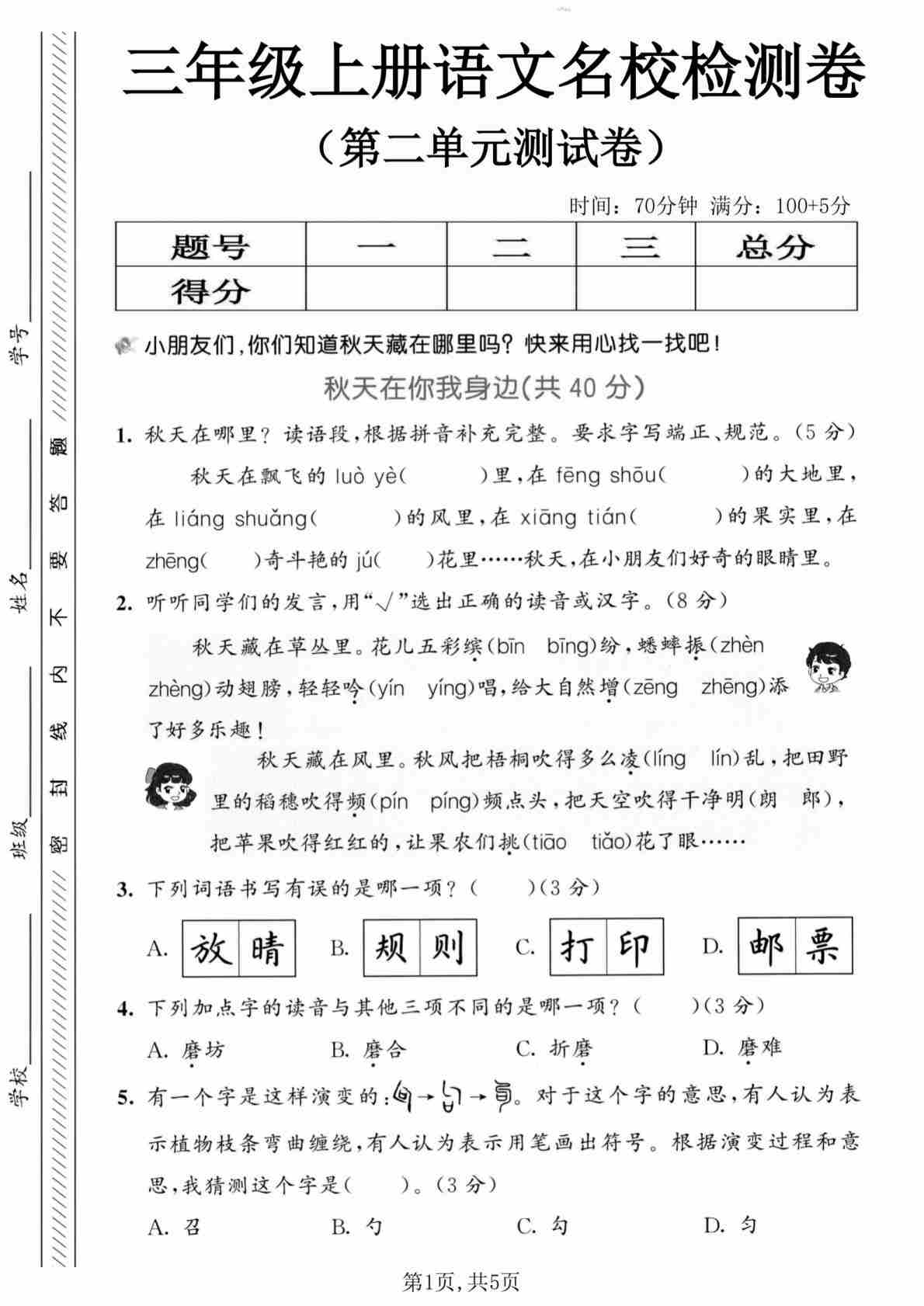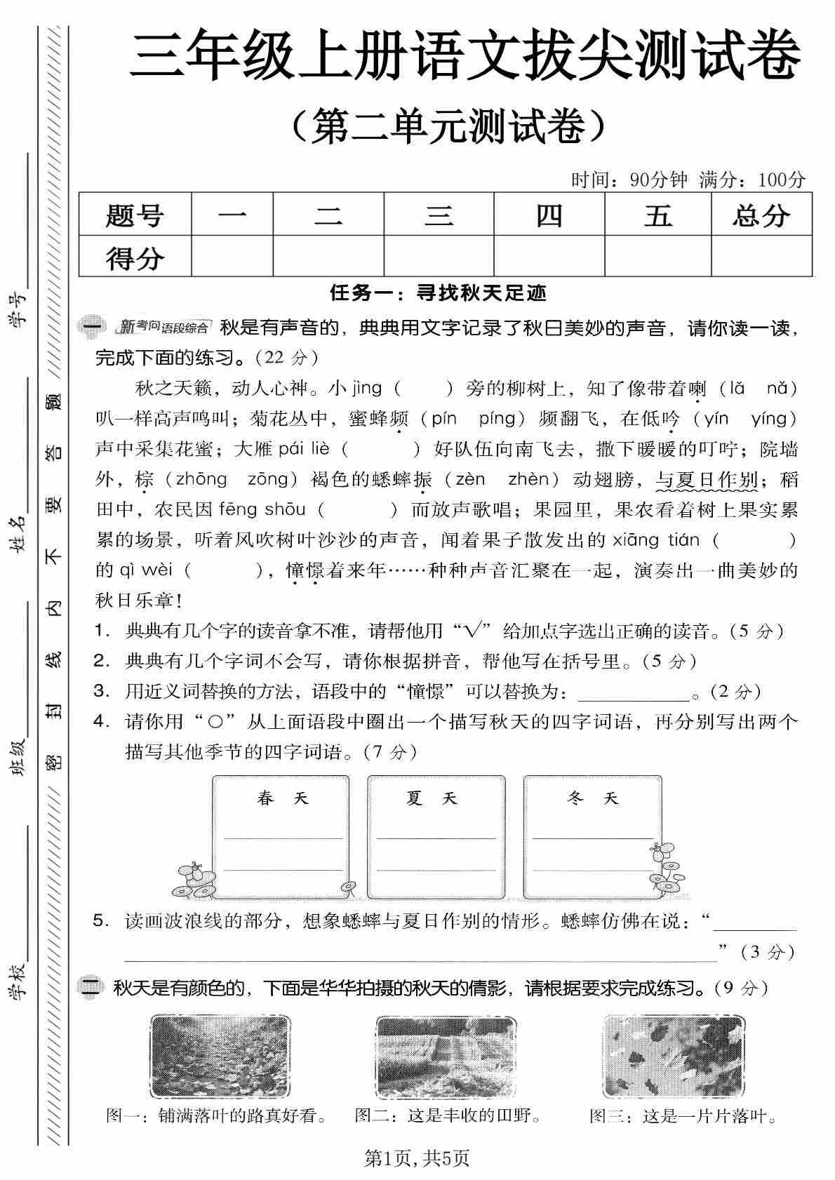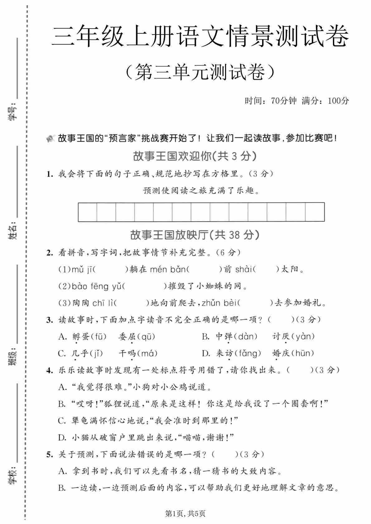 三年级(上)语文 第五单元情景测试卷