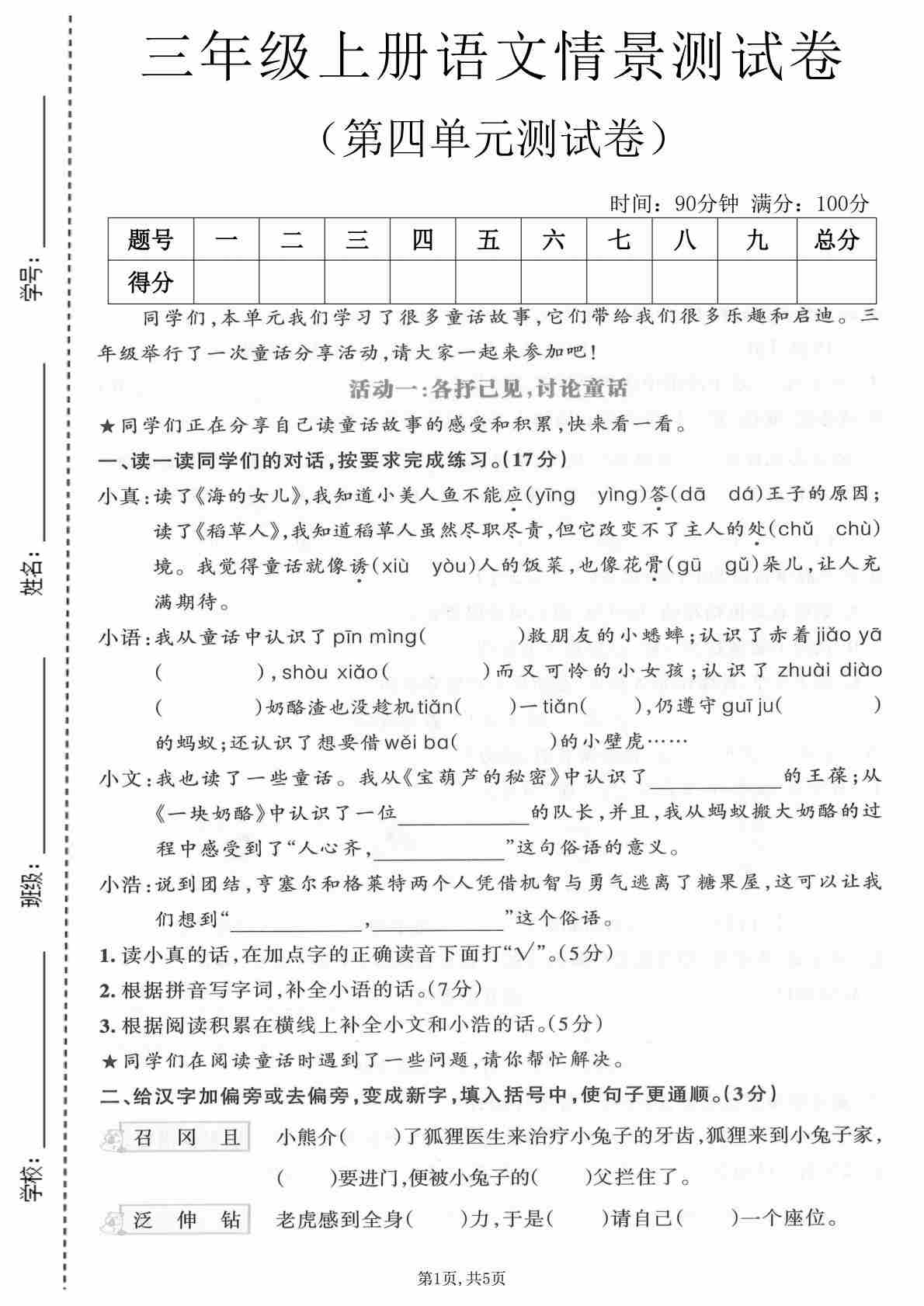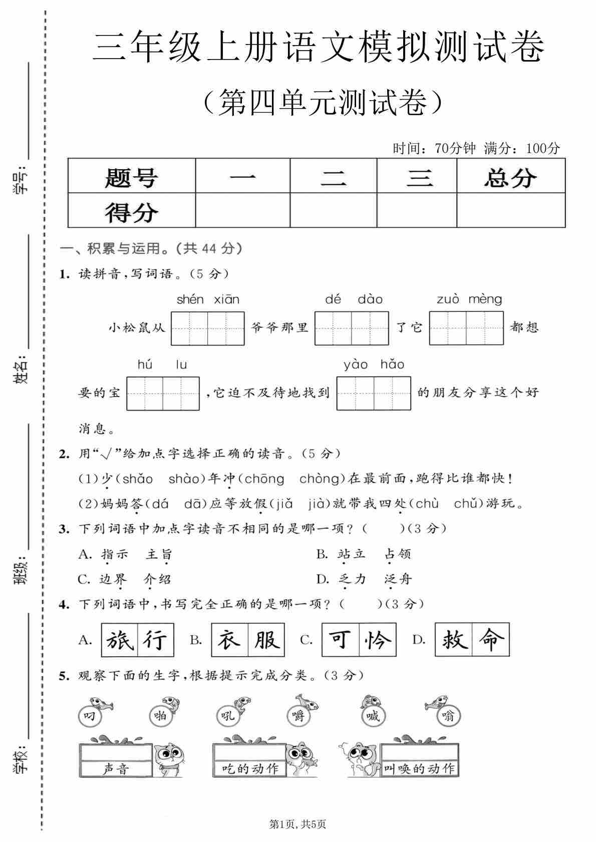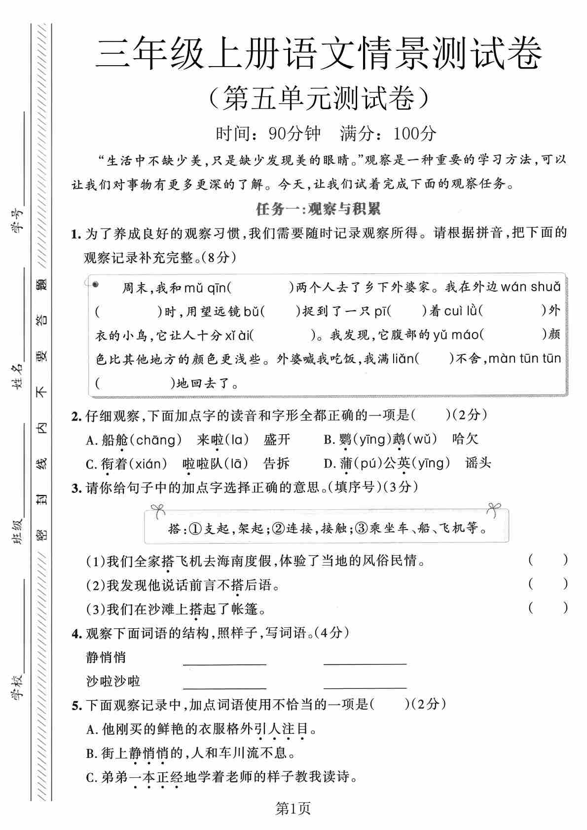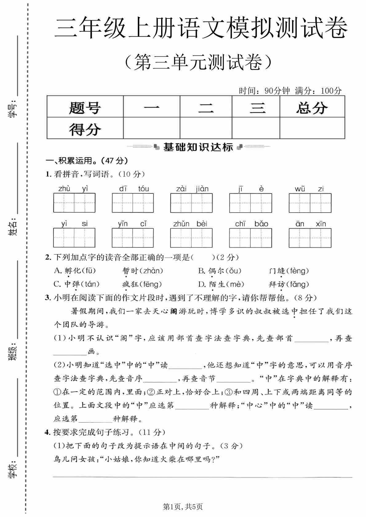 三年级(上)语文 第五单元情景测试卷