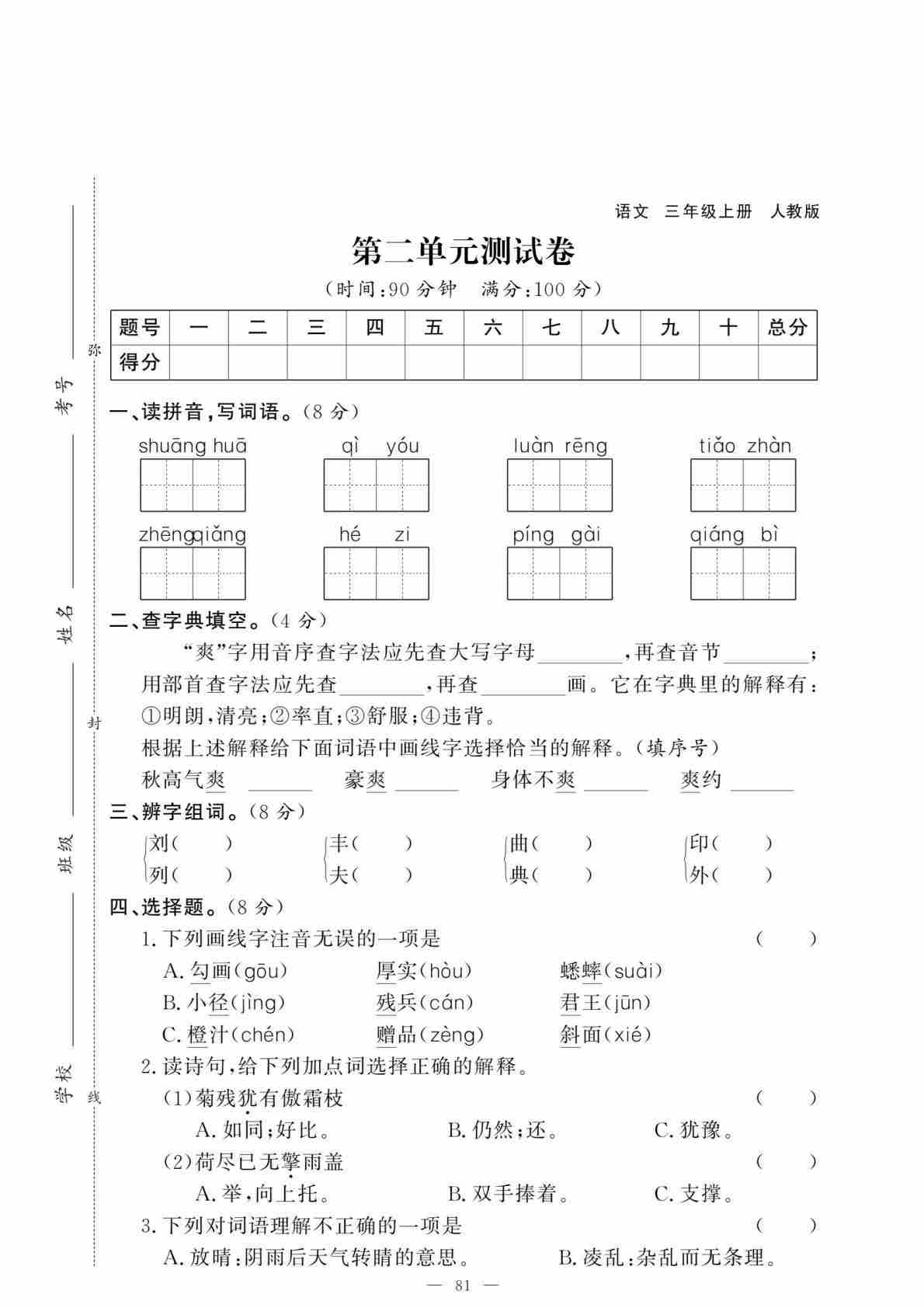 三年级(上)语文 第三单元情景测试卷