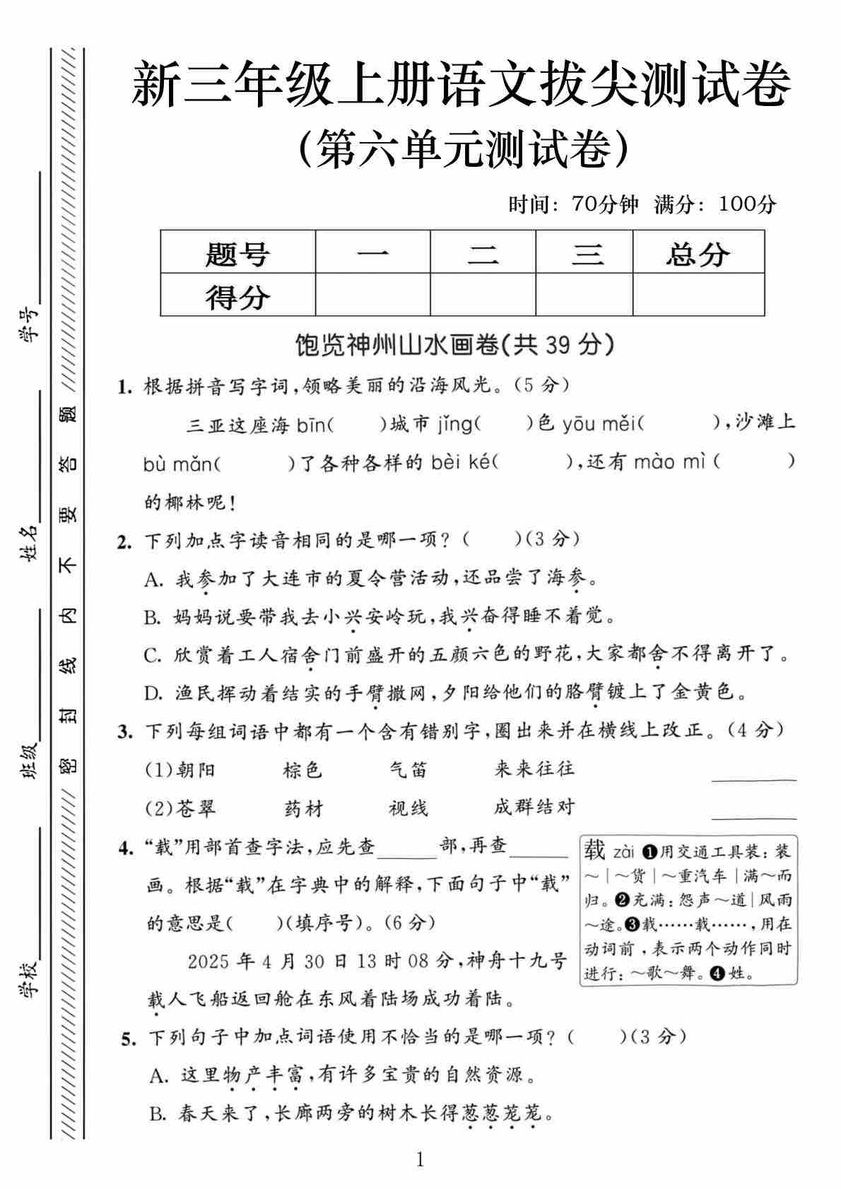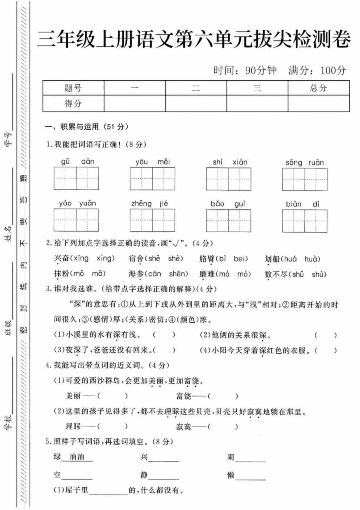 三年级(上)语文 第六单元拔尖测试卷