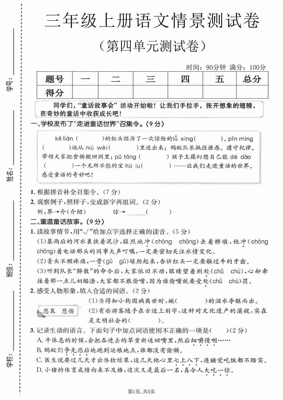 三年级(上)语文 第四单元情景测试卷2