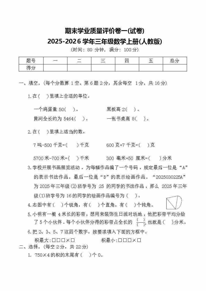 期末学业质量评价卷一(试卷)2025-2026学年三年级数学上册(人教版)
