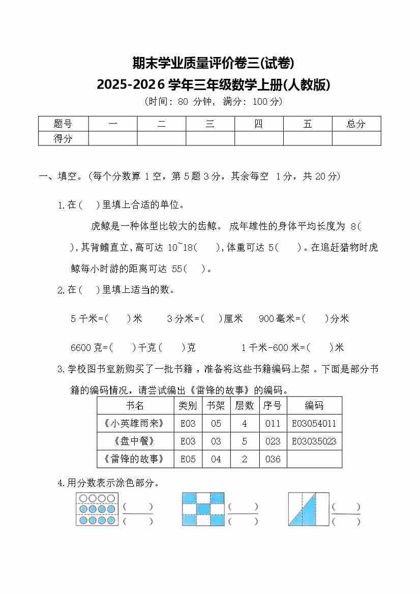 期末学业质量评价卷三(试卷)2025-2026学年三年级数学上册(人教版)