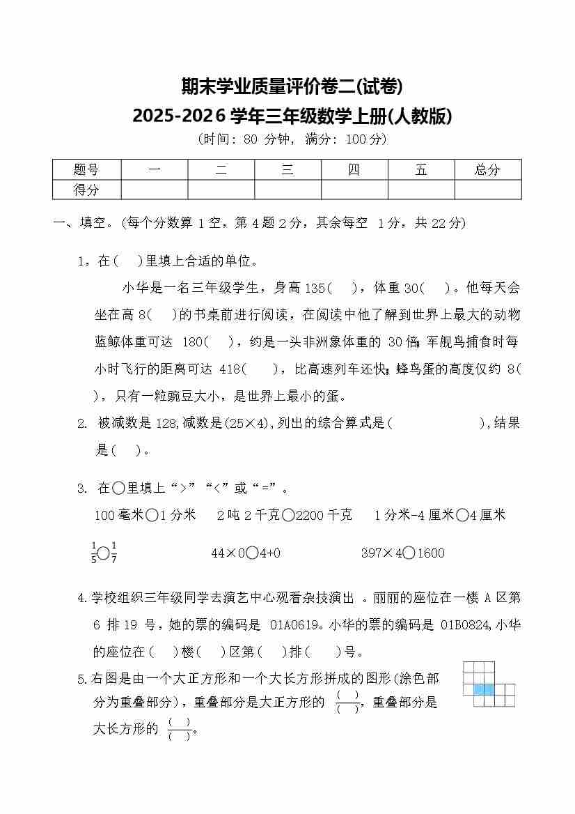 期末学业质量评价卷二(试卷)2025-2026学年三年级数学上册(人教版)