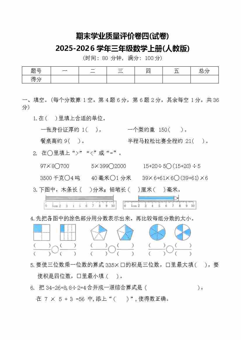 期末学业质量评价卷四(试卷)2025-2026学年三年级数学上册(人教版)