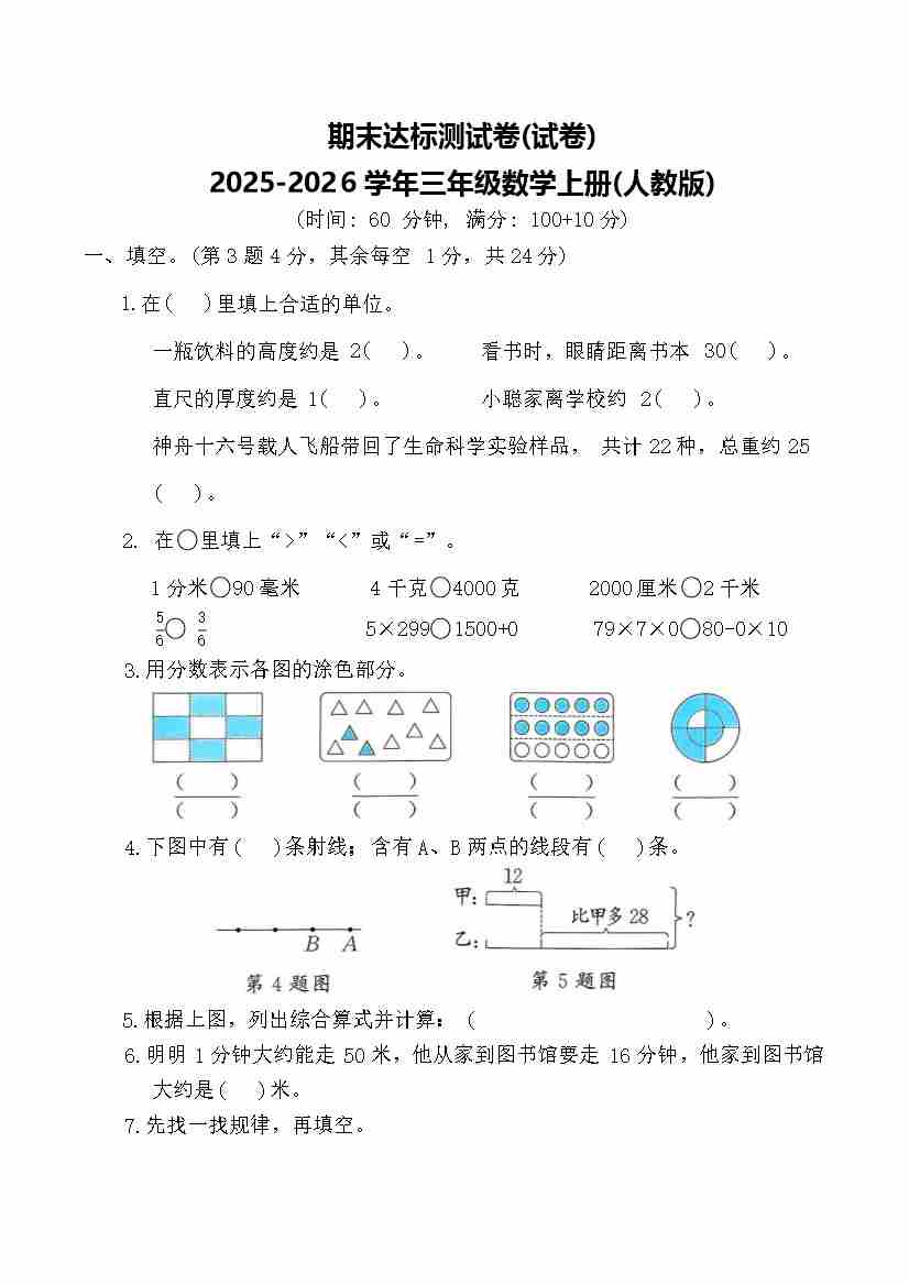 期末达标测试卷(试卷)2025-2026学年三年级数学上册人教版