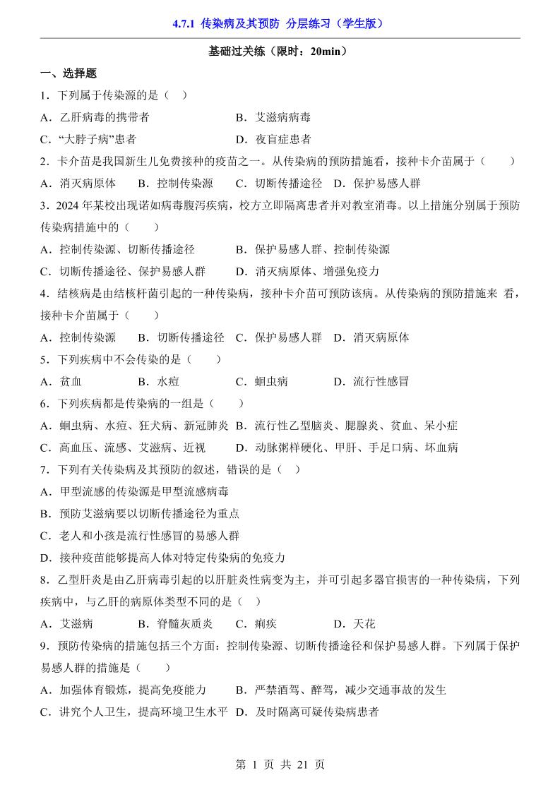 4.7.1 传染病及其预防(分层练习)