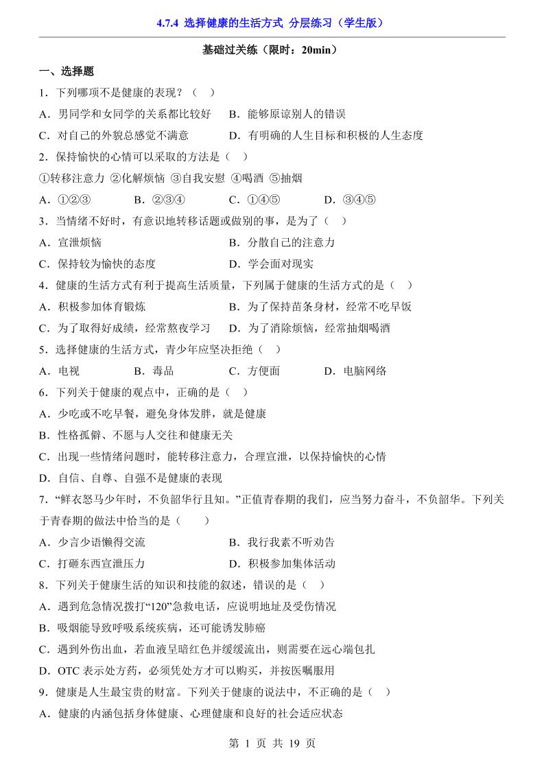 4.7.4 选择健康的生活方式(分层练习)